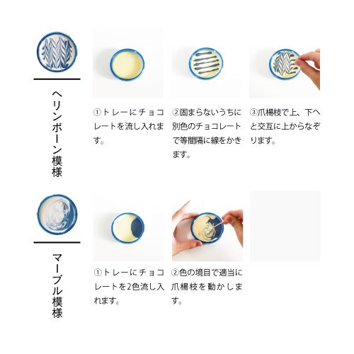 つまようじと2色のチョコレートでラテアートのように模様を描いていきます、
