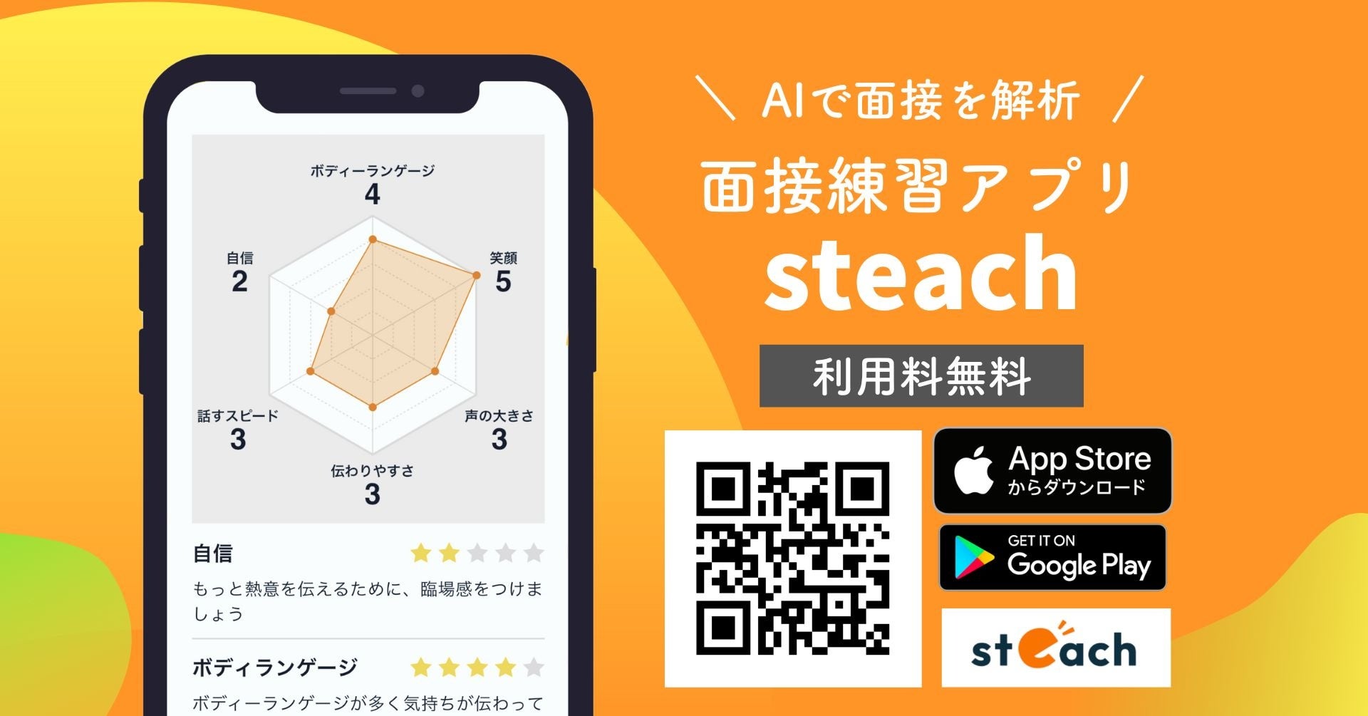 steachは、ユーザーがスマホで面接の質問に回答した音声と動画をAIエンジンが解析し、表情、声、身振りに加えて、文脈を解析することで定量的なアドバイスをAIが行います。面接で頻出する質問のパターンを用意しており、新卒、転職、アルバイトなどの多様な面接シーンで活用いただけます。