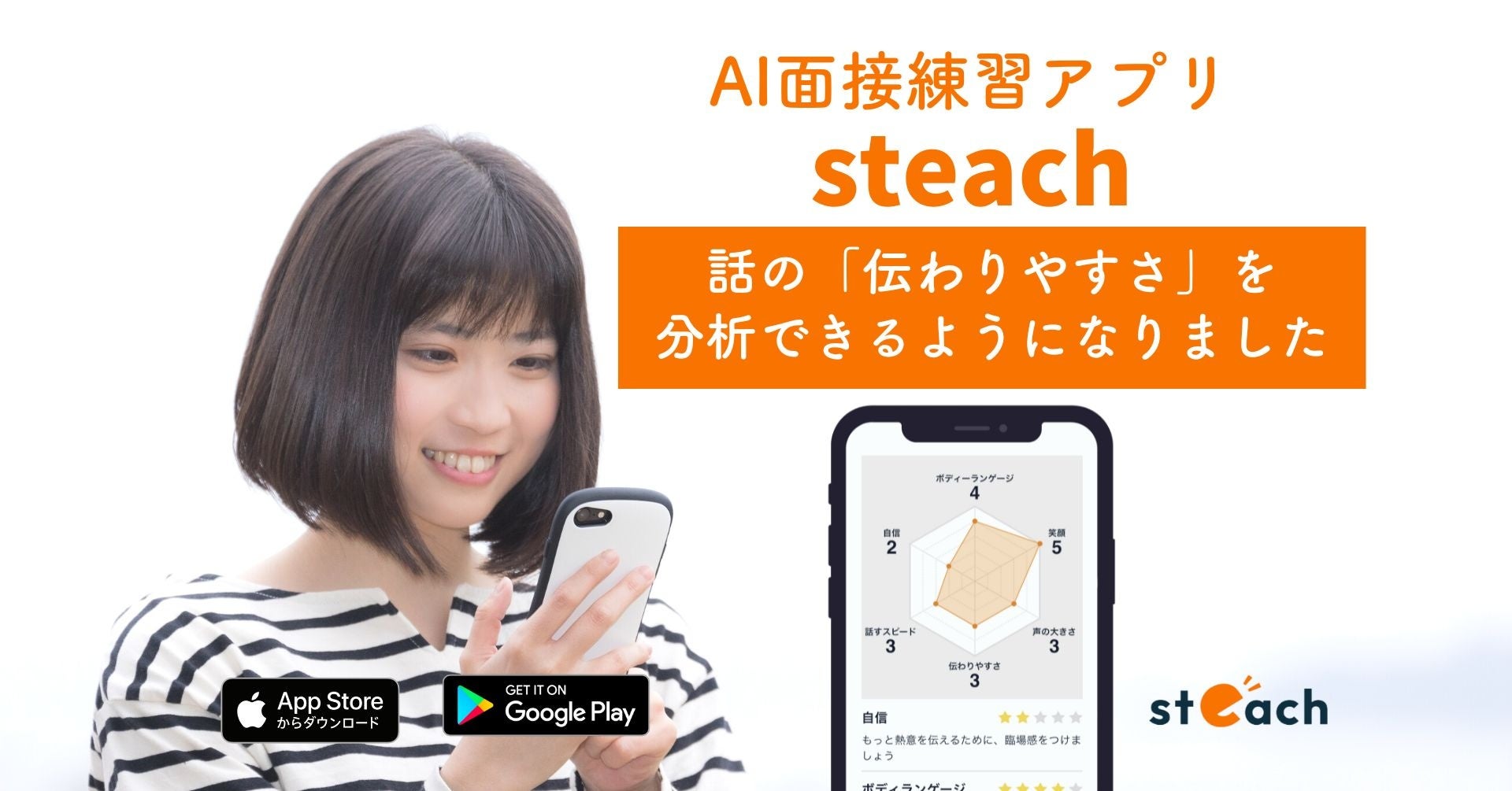 株式会社エフィシエント(本社:横浜市西区 代表取締役社長:脇坂健一郎 以下、EFFICIENT)と、就職支援事業を展開する株式会社ジェイック(本社:東京千代田区 代表取締役社長:佐藤剛志 以下、ジェイック)が共同開発する面接練習アプリ『steach』は、大幅に機能をアップデートし、自然言語処理を活用し会話の内容をAIが解析することで「伝わりやすさ」を定量評価できるようになったことをお知らせいたします。