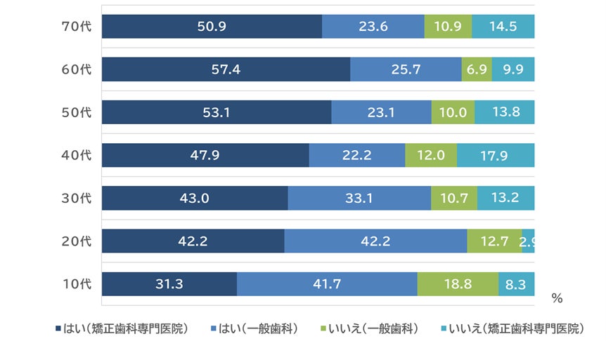 10代では「はい(一般歯科)」が41.7%、「はい(矯正歯科専門医院)」が31.3%、20代では両者が42.2%と同率だった。