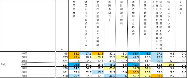 矯正歯科医院を選ぶ際の注目点として、全年代で「口コミ」および「通院に便利な立地条件」が高く挙がっている。