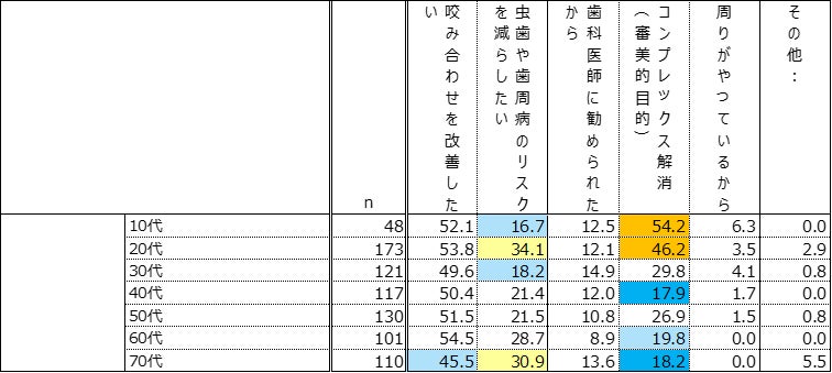 10代~20代ではコンプレックス解消(審美的目的)の割合が高く、10代は54.2%、20代は46.2%と半数前後を占めている。若年層は矯正を「治療」よりも外見を整える手段としてとらえる傾向にあるとうかがえる。また年齢があがるにつれ割合が低くなっている。