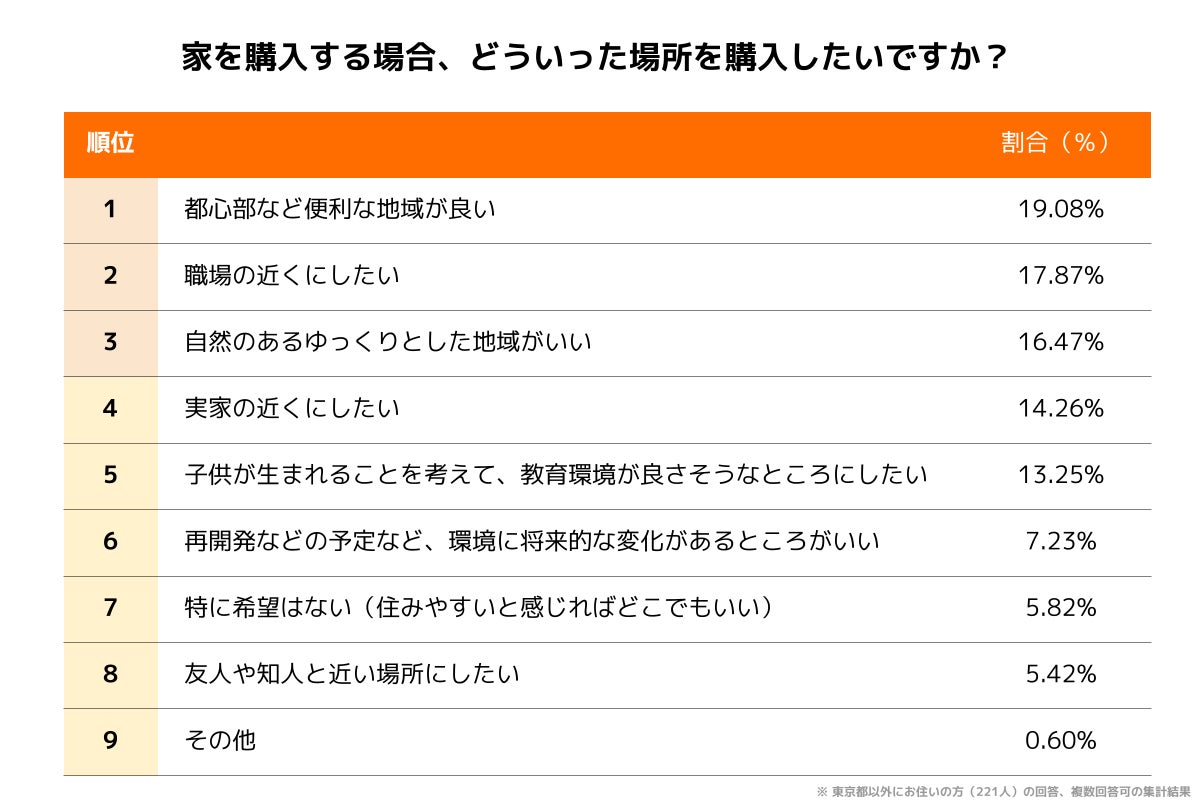 東京都以外にお住まいの方(対象:221人)に住宅を購入する時に、どういった場所に購入したいか?をお聞きしました。
