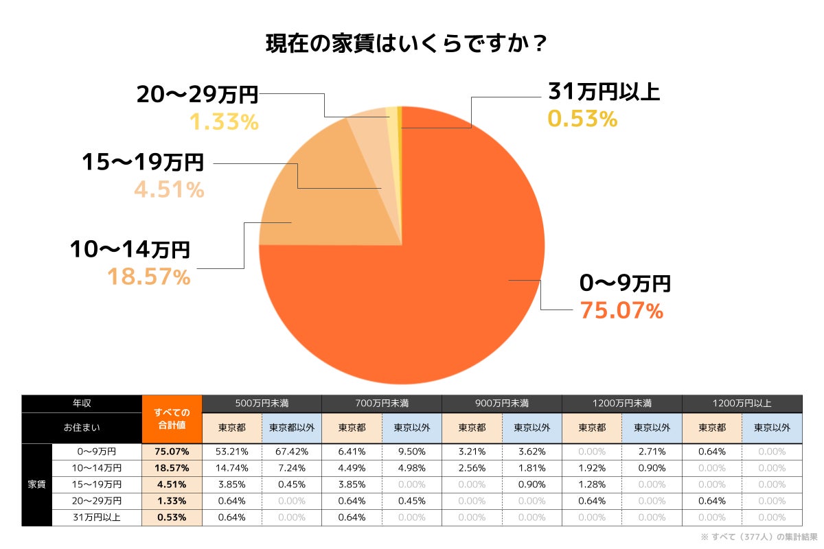 今回の集計では家賃補助を含めての金額になっているため、正確な数字は把握できませんが、年収別で見ても、年収が高くなっても家賃にかける金額が上がっているようには見えません。