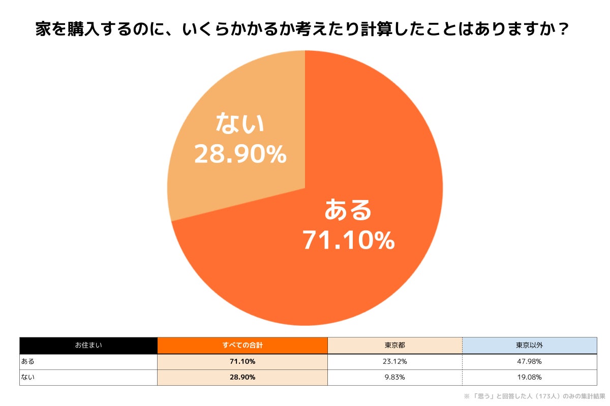 将来は家を買おうと思っていますか?で「思う」と回答した人の中で、いくらかかるか考えたり計算したことがある人は71.10%でした。