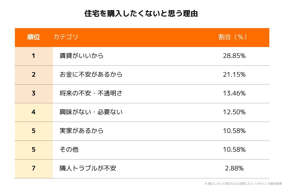 次点では「将来の不安・不透明さ」で13.46%で、「地震などの災害が多いので、購入はリスクと考えている」「将来の資産価値が落ちそうだから」「固定資産税や維持管理費がかかったり、もし手放したくても売れない事ある」といった、今後どうなるか分からない不安の意見がありました。
