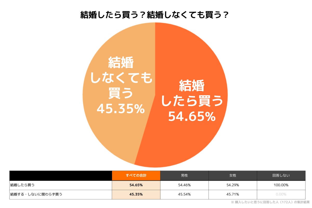 また、「家を買おうと思う」と回答した172名の内、54.65%(94名)が「結婚をしたら買う」と回答しています。
