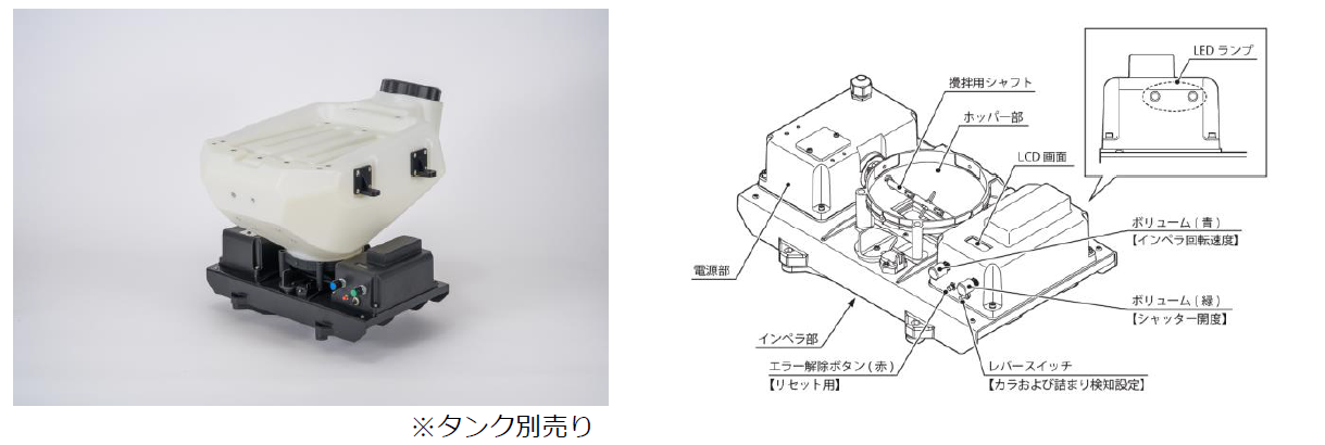 ・吐出量:最大10kg/分 ※1キロ粒剤 (3mm)実施時