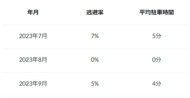 3ヵ月間(2023年7月~2023年9月)の逃避率は0%~7%で推移し、逃避された駐車時間は0分~5分でした。