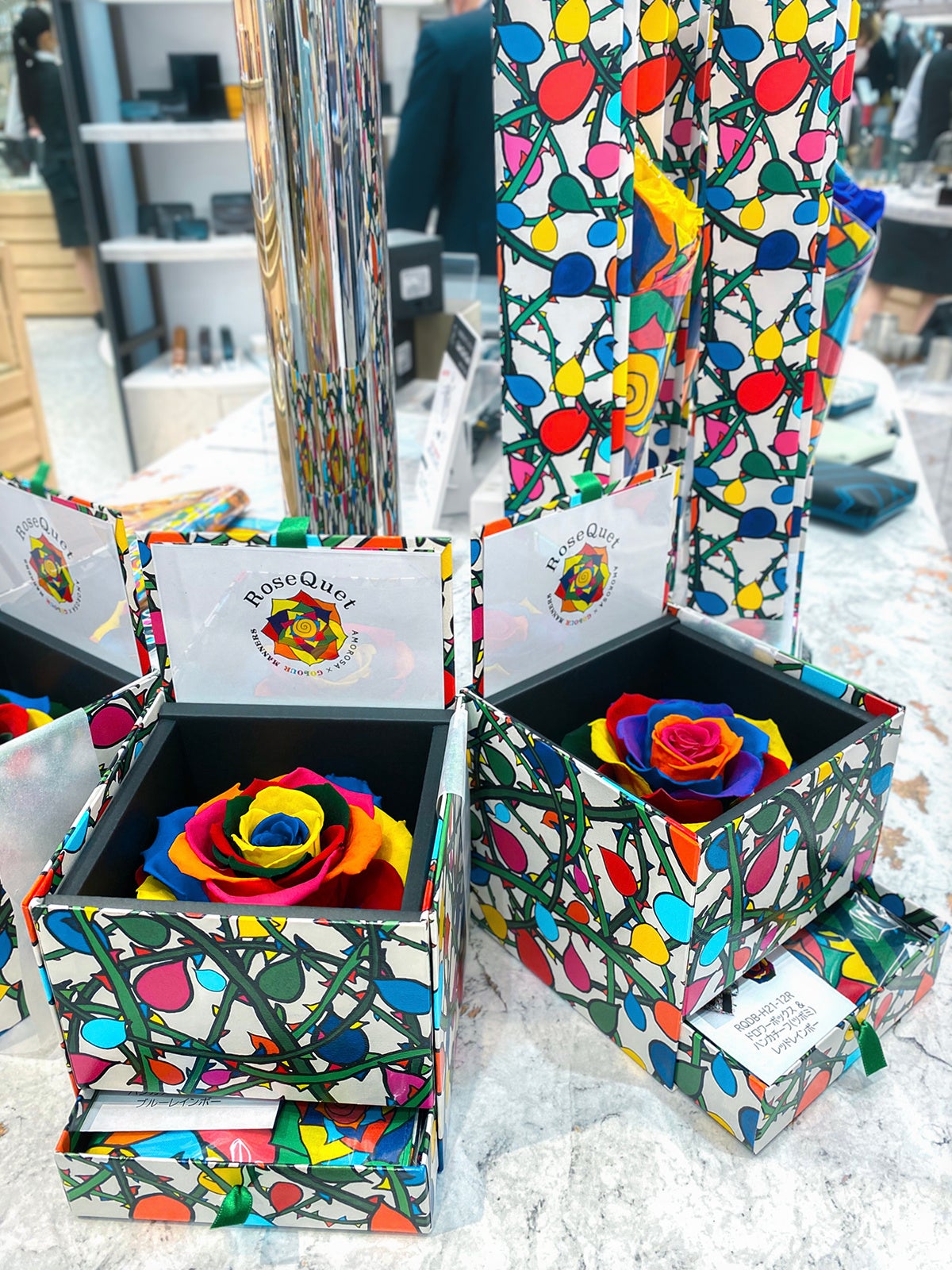 代表作・マルチカラーSPECIALエナメルトートシリーズ、本物のバラとハンカチーフが織りなすローズアート「RoseQuet」などが人気。