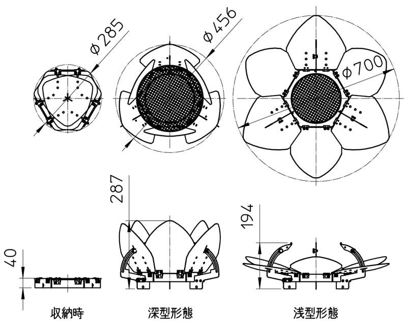 花びらを閉じた状態にすると「深型焚火台」になります。この形態の時は「燃焼場所が深い」のが大きな特徴です。燃焼場所が深く覆われているため防風効果が高いのがメリットです。また、花びらに炎が反射して、幻想的な光景が現れます。炎と共に花びらで舞う明かりの美しさを堪能して下さい。