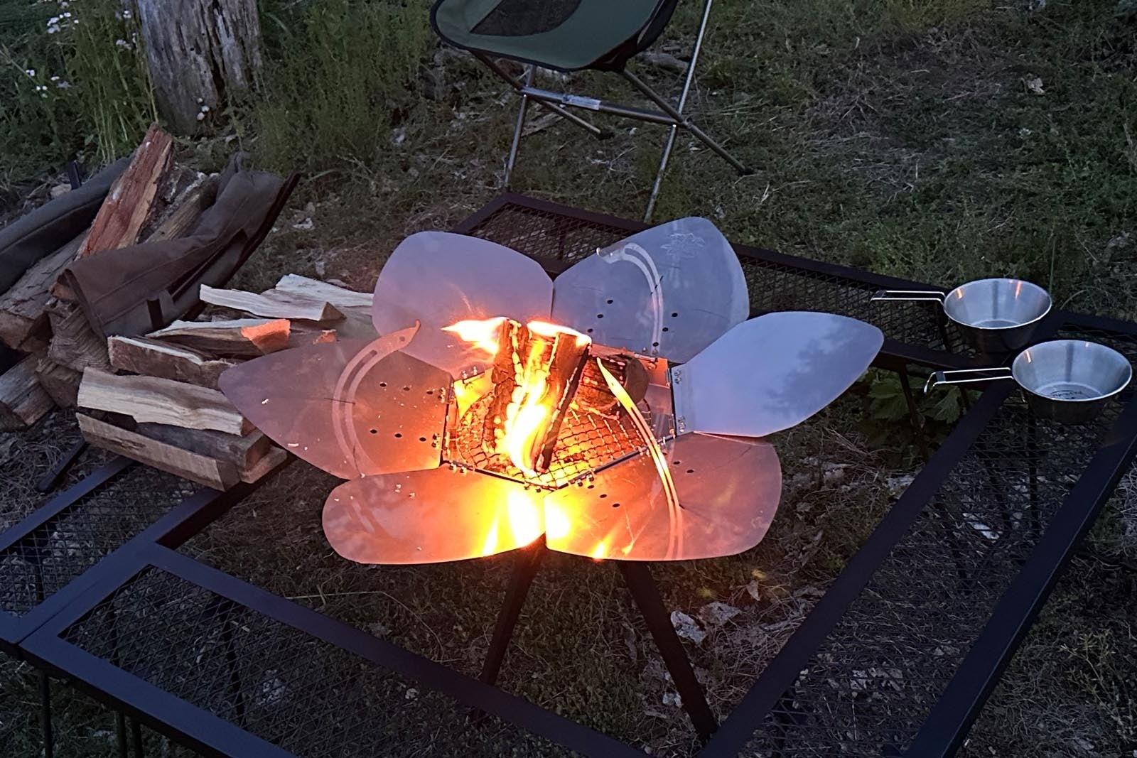 花びらを開くと、「浅型焚火台」になります。その直径は70cmもあるので40cmの長さの薪でも割らずにまるごと投入することができます。市販の薪を持っていっても割る手間なく、そのまま使えます。浅型の焚火台となりますので、薪も炎もよく見えて、ダイナミックな焚き火を楽しめます。薪を組み替えたり取り出しやすく火の調整がしやすいです。炎を楽しむのに向いています。