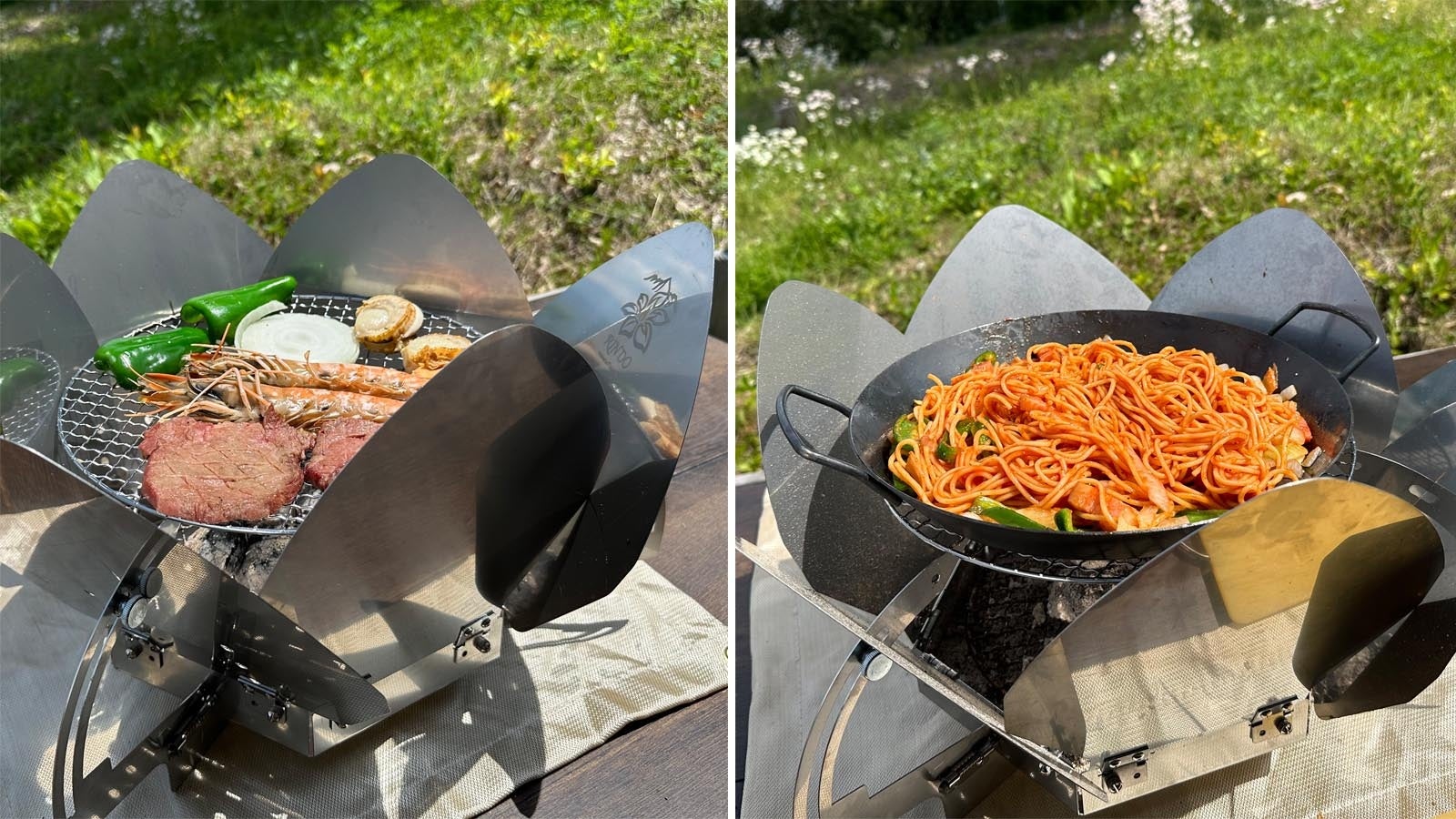 閉じた状態で薪の代わりに炭を使うと、バーベキューコンロとして使えます。やはり風の影響を受けにくく安定した調理ができます。閉じた状態だと場所を取らないので、テーブル上でもバーベキューを楽しめます。