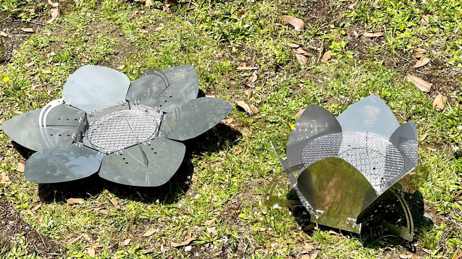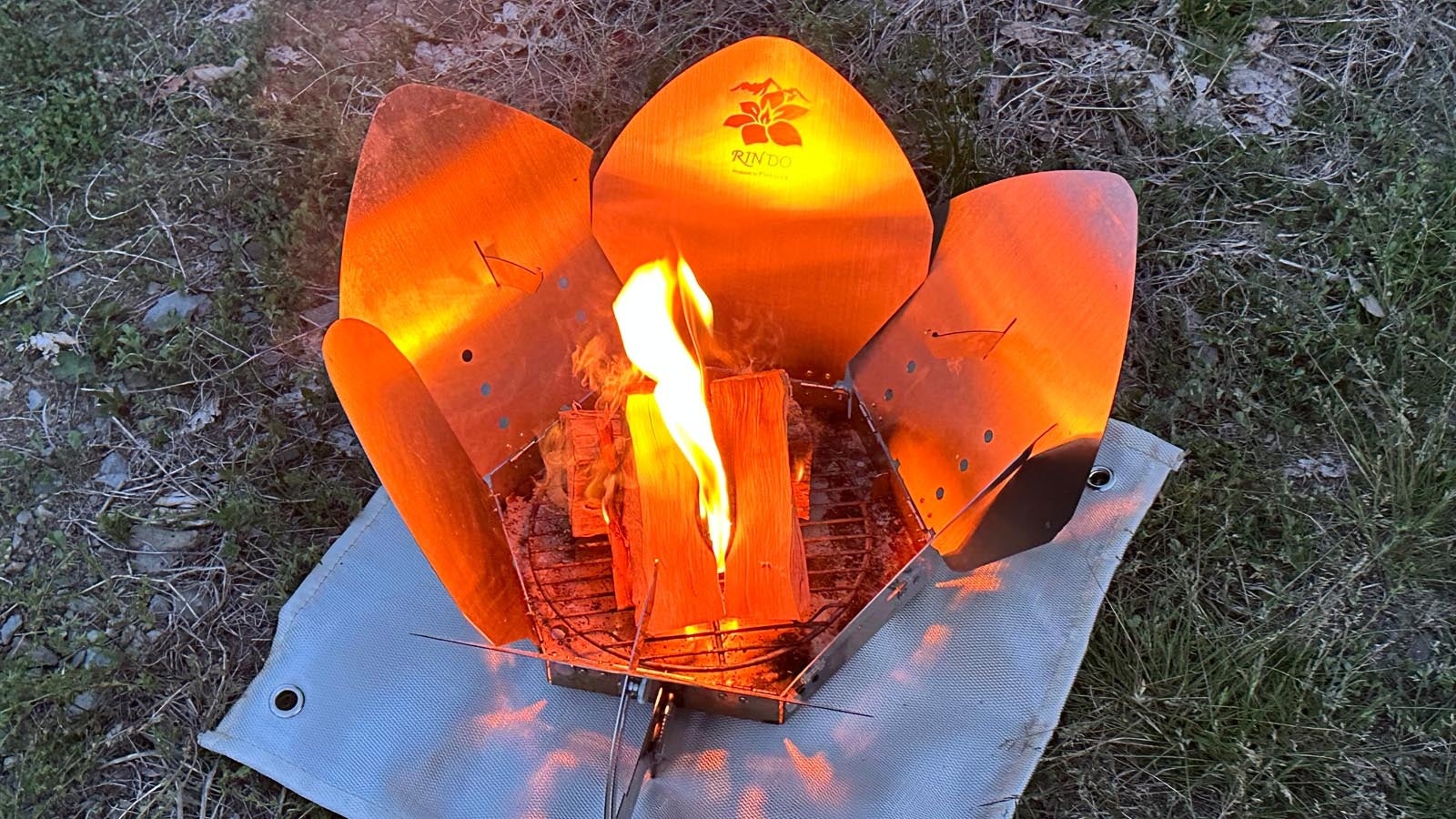花びらをモチーフにした6枚の板を火床となる底部に回転可能に取り付けることで、閉じて、開いてと、まるで花が咲くようなアウトドアギアを作り上げることができました。そして商品名も「RINDO」といたしました。「信州」の自然と共にできあがった花咲くアウトドアギアです。是非かわいがってください。