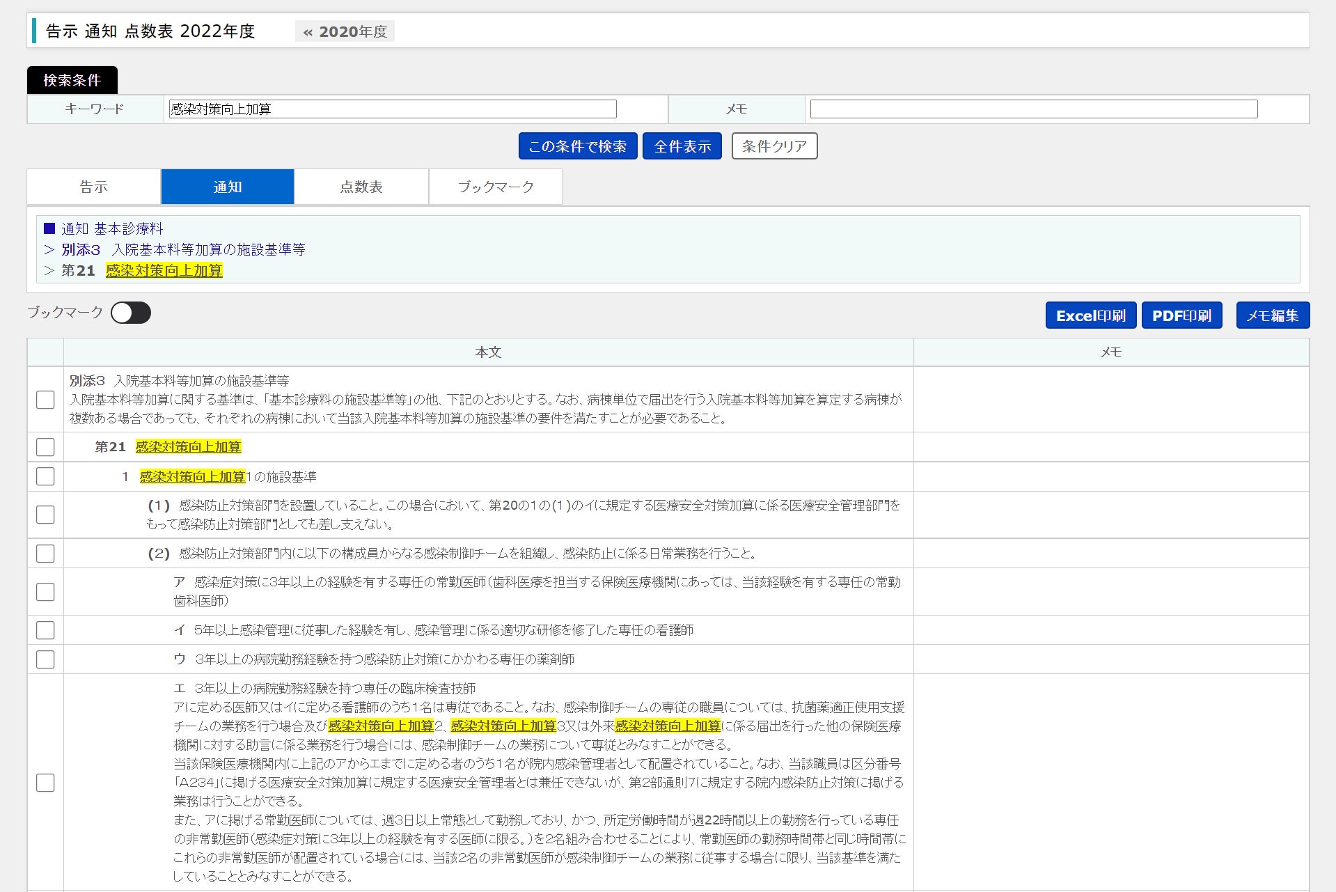 2022年度「告示」「通知」「点数表」の検索・閲覧およびExcel及びPDFでの出力ができるようになりました。