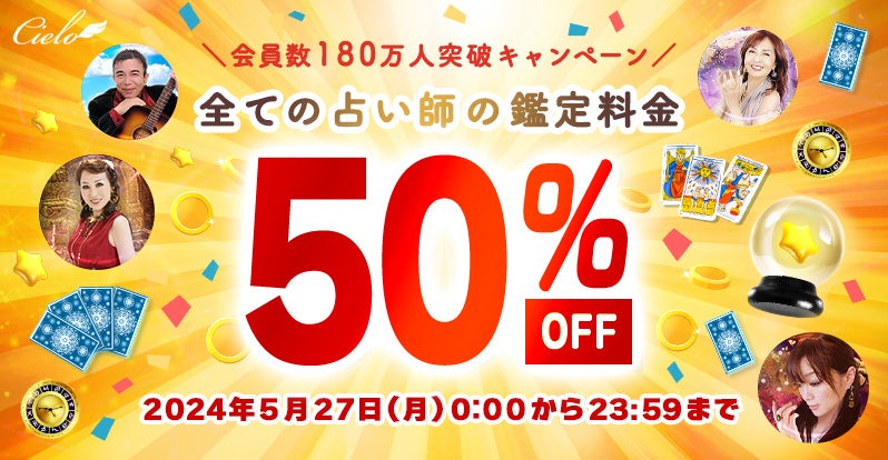 占いサービス「電話占いシエロ」を運営する株式会社シエロ(本社:東京都渋谷区、代表取締役社長:原田卓也、以下 シエロ)は、会員数180万人突破を記念して、シエロに在籍するすべての占い師の鑑定を半額でご提供する特別キャンペーンを開催いたします。この機会にぜひ、シエロの占いを体験してください。