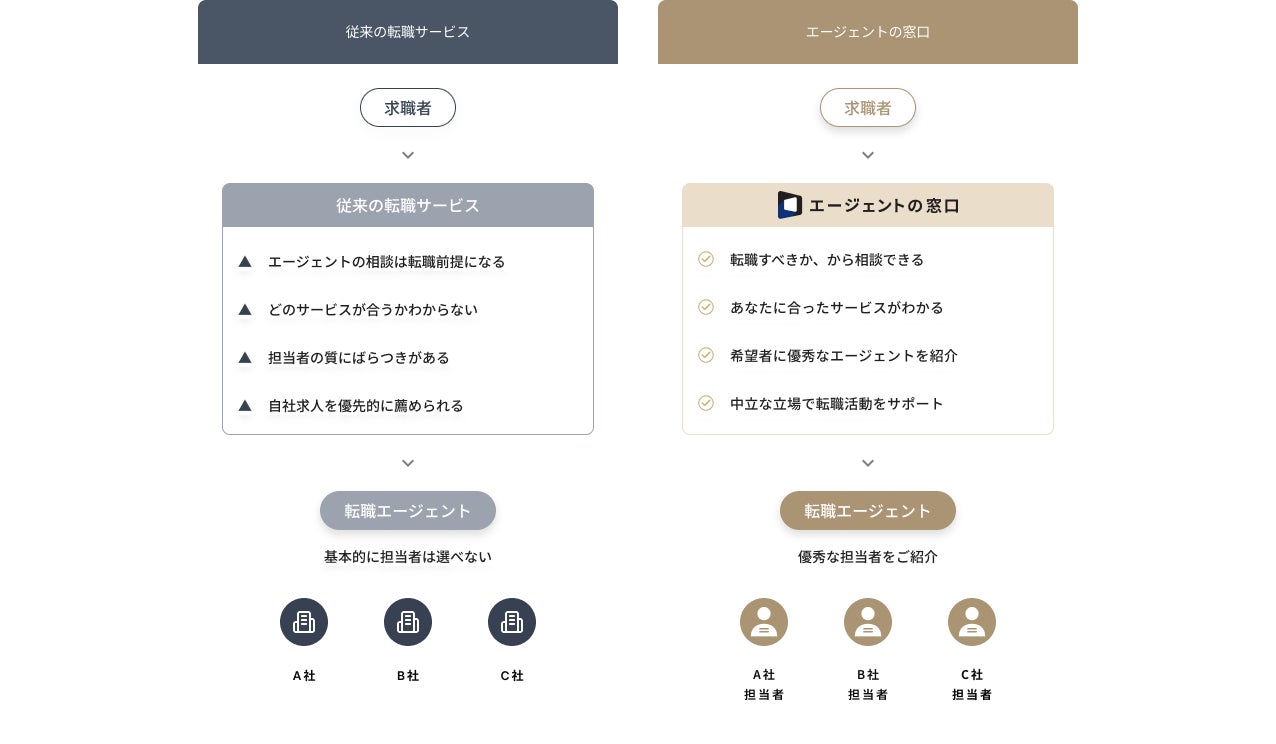 こうした「相談の場の中立性不足」や「エージェント選定の難しさ」を解決するために立ち上げたのが『エージェントの窓口』です。
