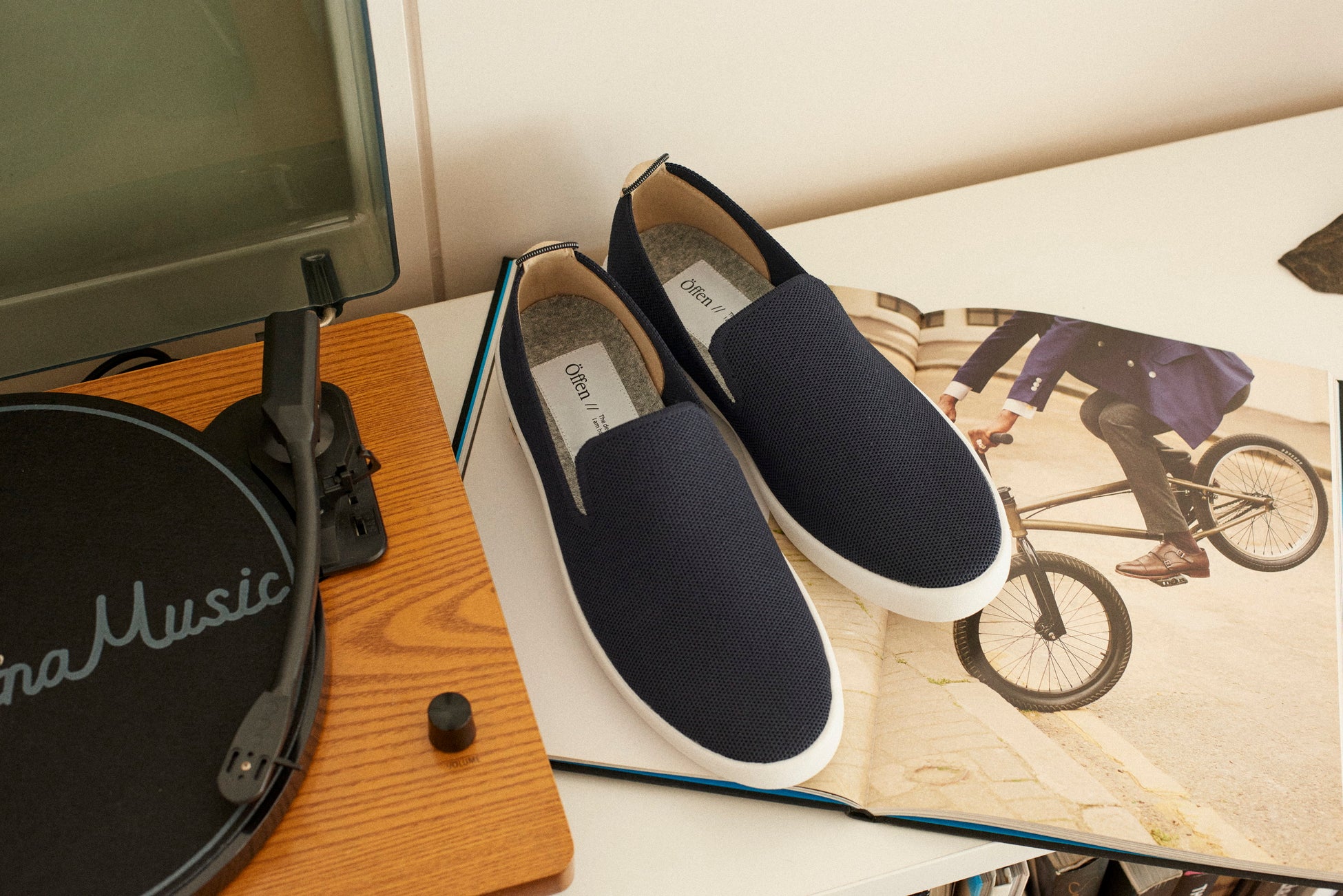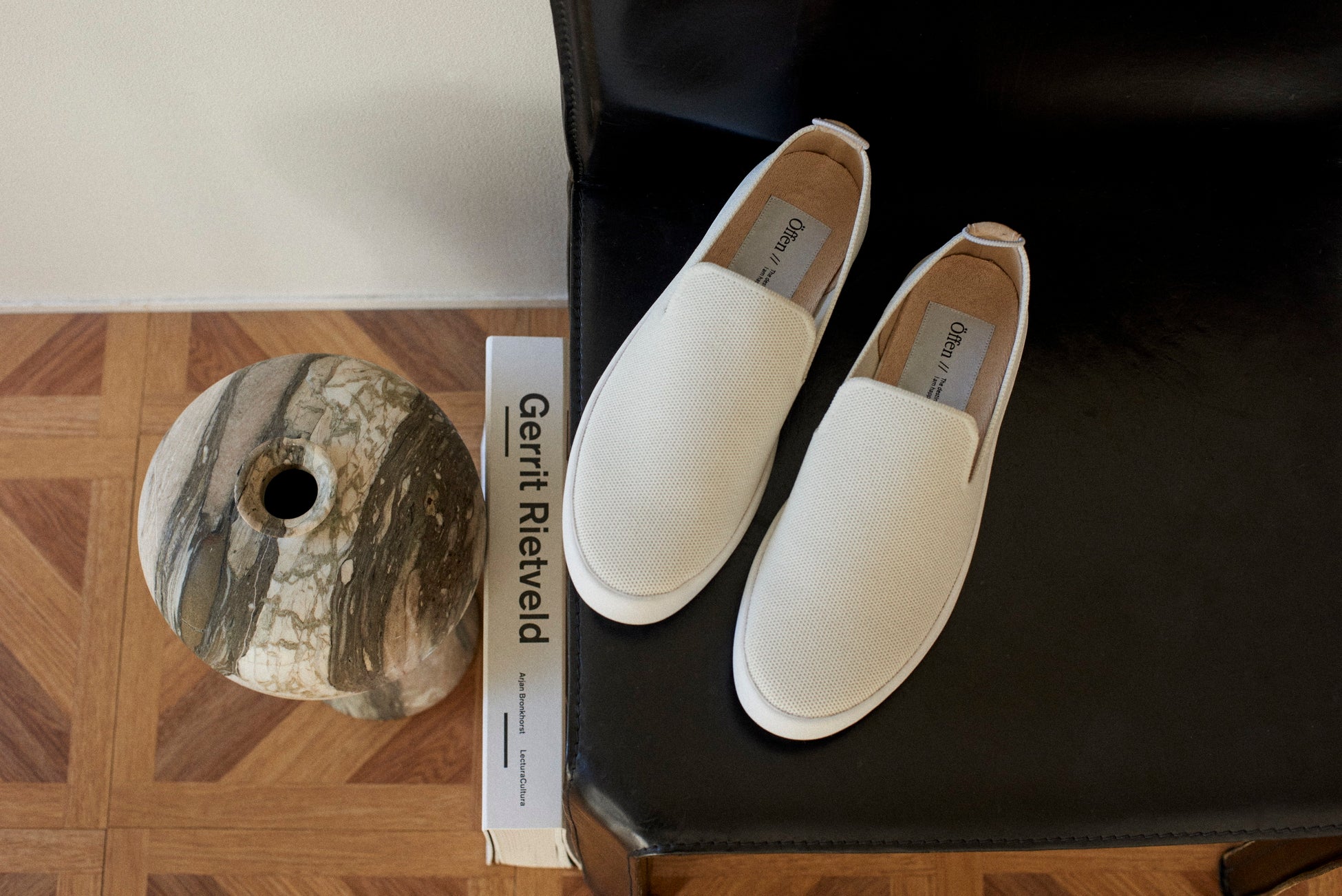 Öffen(オッフェン)メンズラインはカジュアルながらも形が綺麗で大人の品格を格上げし、軽やかで足を包み込むフィット感、素足履きも可能なので、足裏に大地を感じリラックスしたはき心地を実感。地球環境に負担をかけない素材と製法を採択し、一足で様々なシーンに活躍する新感覚のサステナブルシューズです。