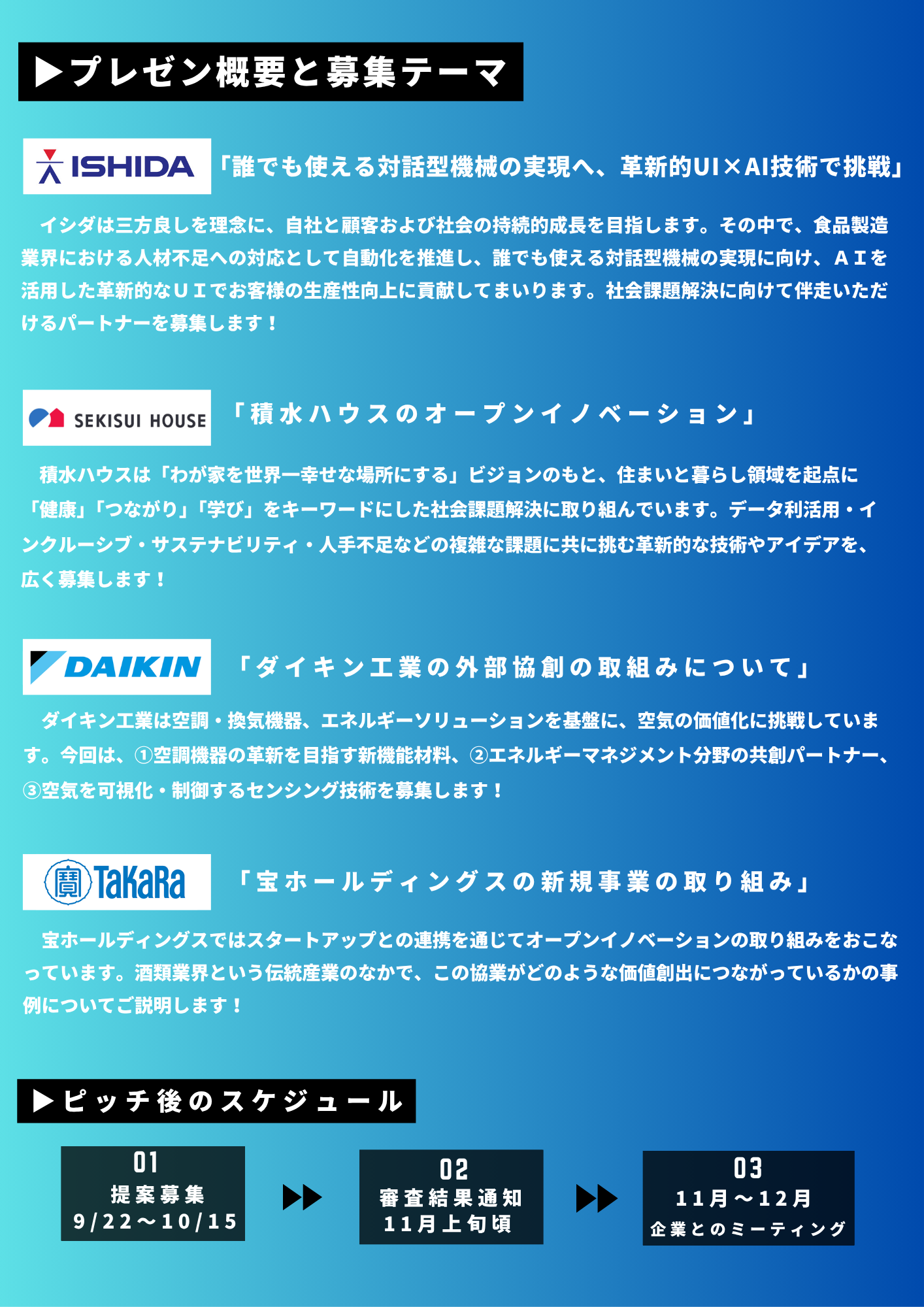 今回で3回目の開催となる本イベントでは、株式会社イシダ、積水ハウス イノベーション&コミュニケーション株式会社、ダイキン工業株式会社、宝ホールディングス株式会社の4社が登壇。各社がオープンイノベーション戦略や具体的な事業テーマをプレゼンするほか、名刺交換会・ネットワーキングとして貴重な交流の機会もご用意しております。