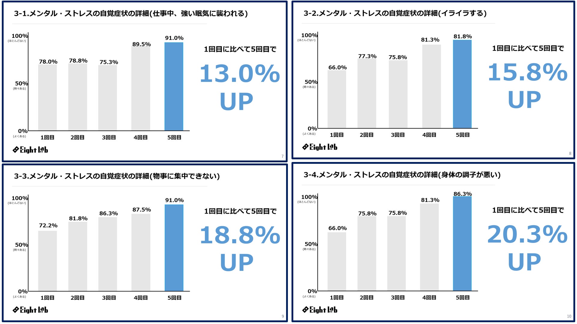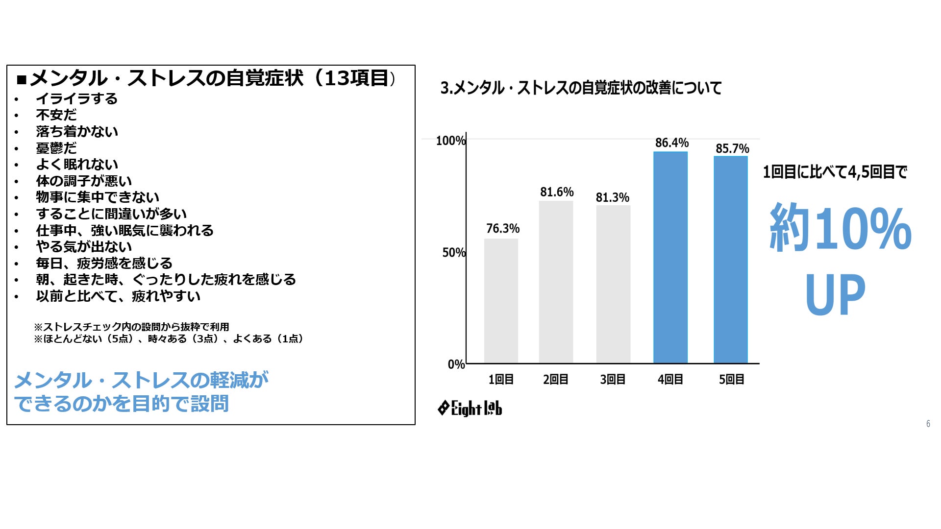 より良い働き方を提案する株式会社EightLab(東京都千代田区・代表取締役:早川隆之・高山耕輔 以下EightLab)は東京電力健康保険組合(東京都荒川区・ 以下東電健保)および東京電力パワーグリッド静岡総支社の協力のもと、健康プラットフォーム「Carefor」のサービスの一つであるボディケアを通して、メンタル・ストレスの自覚症状の変化や、健康に関しての意識変容についての実証実験を行いましたのでご報告いたします。