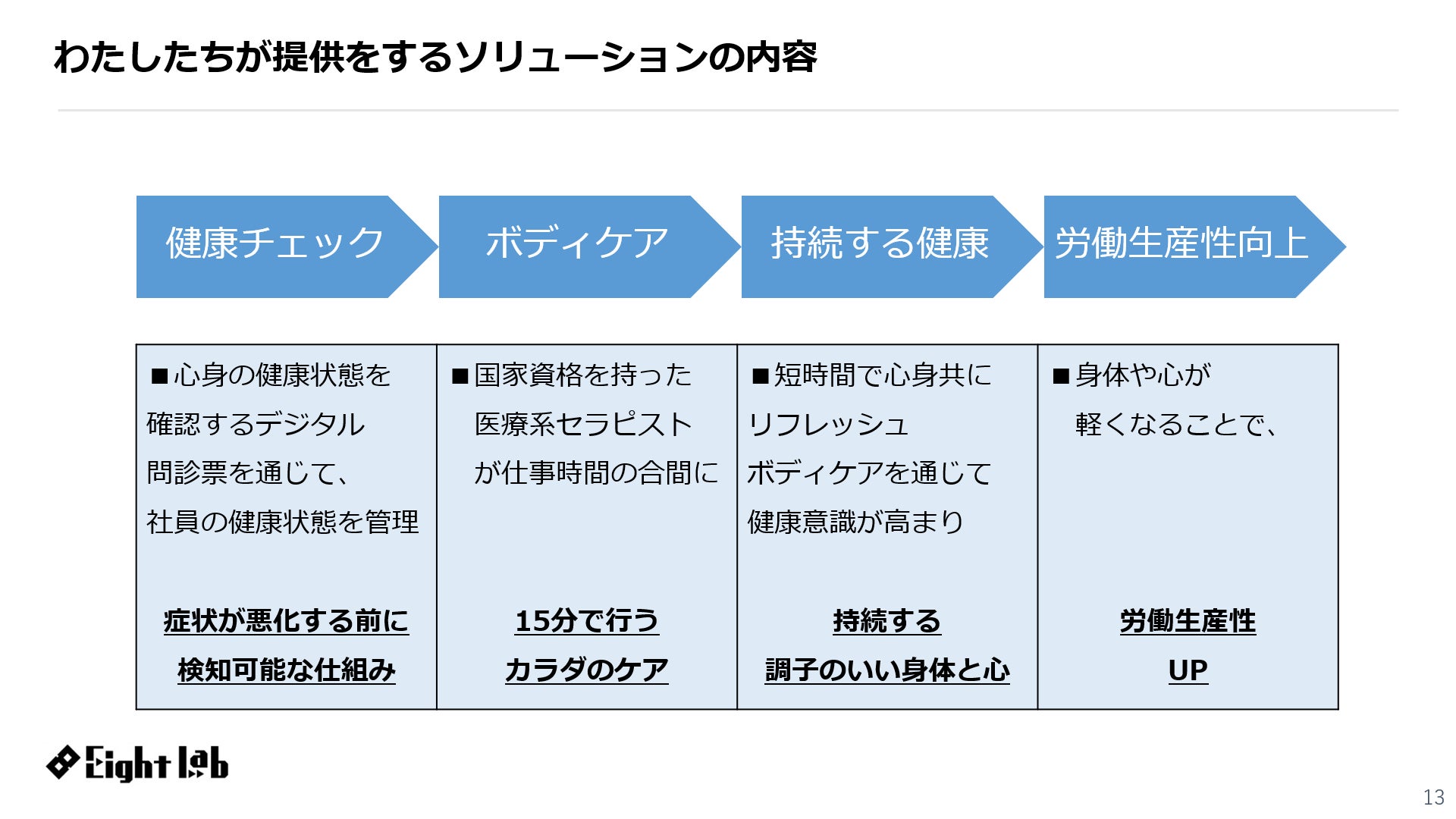 現在は主にボディケアを中心に展開、企業内+就業時間内に身体ケアを行います。