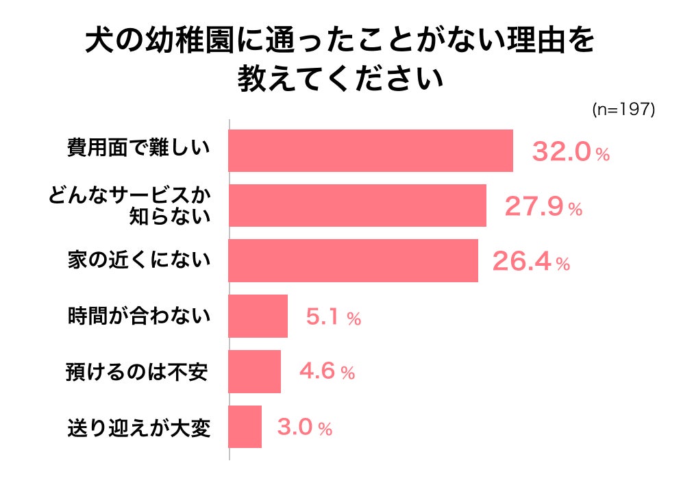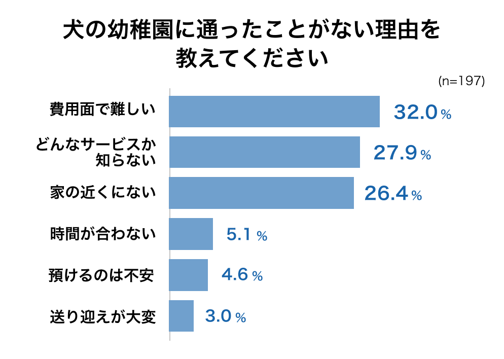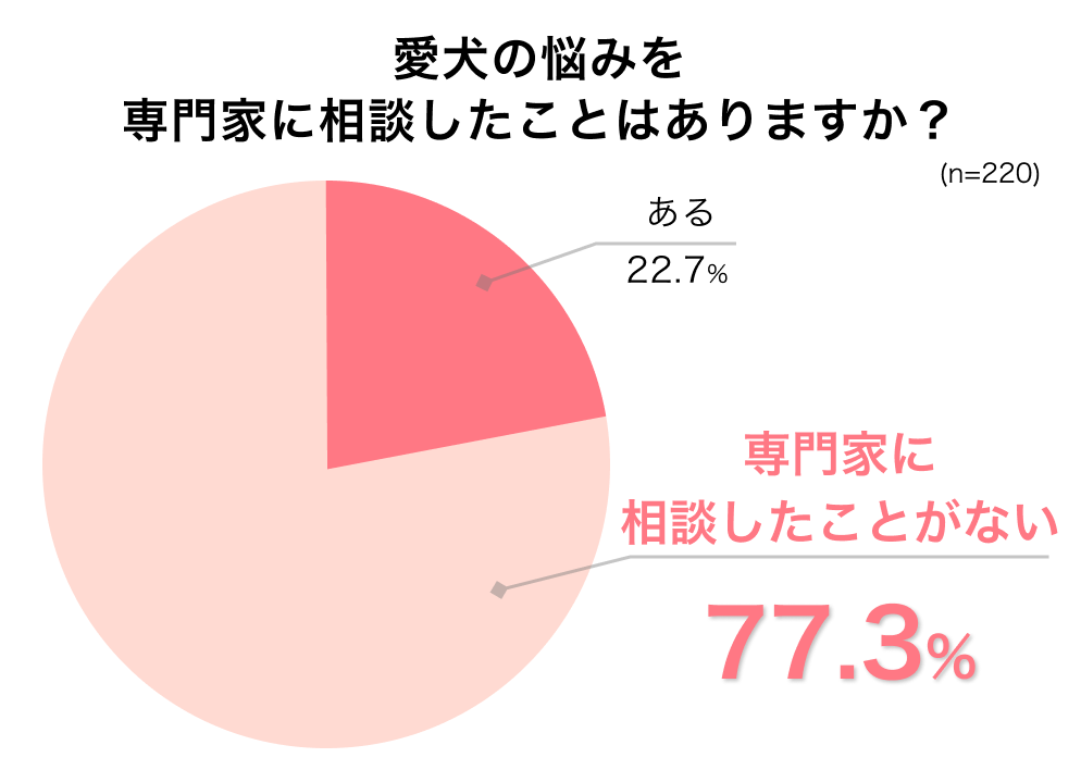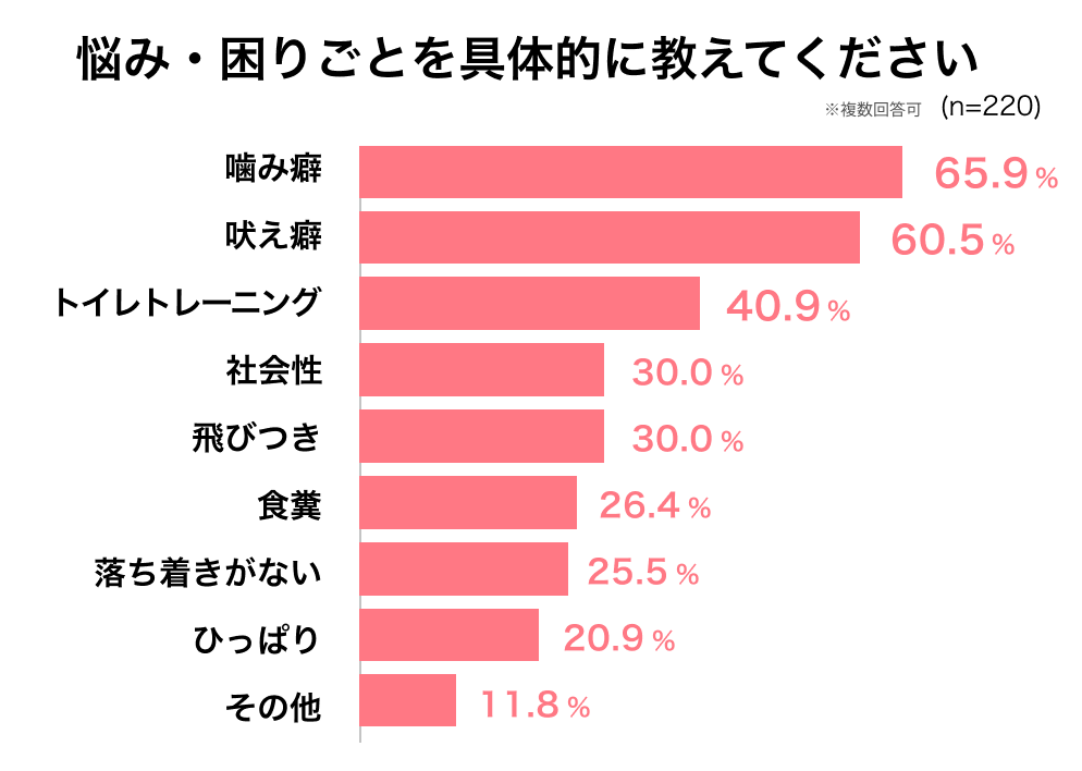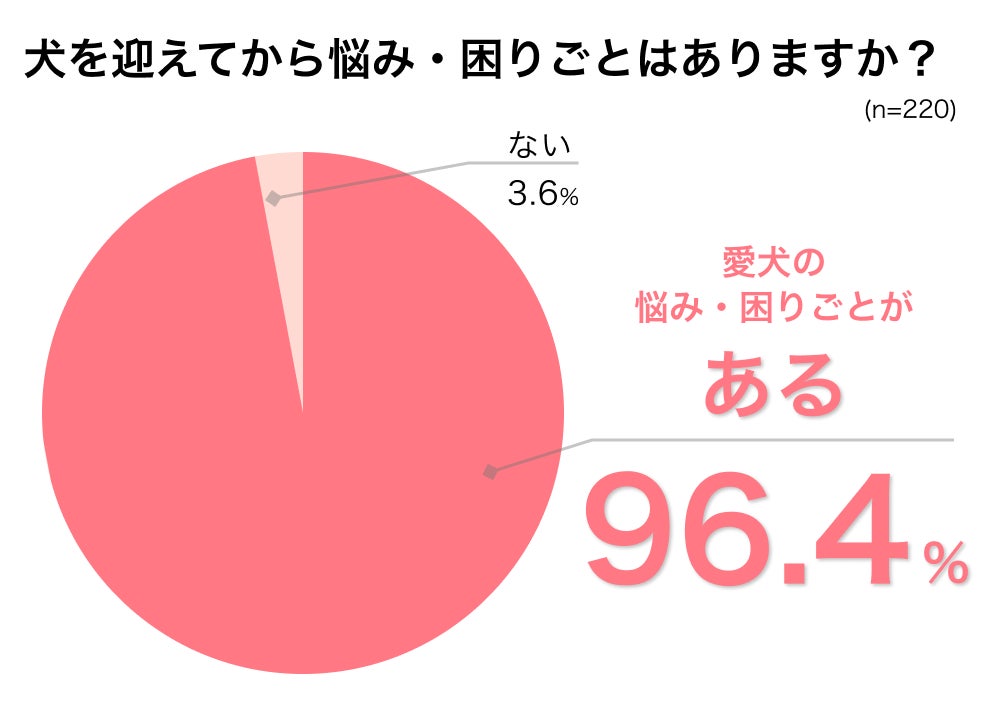愛犬との生活の中で、悩みや不安を抱えている方の割合は96.4%と非常に高く、また悩みの種類や度合はお一人ずつ異なります。犬種、性格、生活環境によっても解決方法は異なるため、画一的な指導法やマニュアル通りの対応では、解決は難しいと考えています。