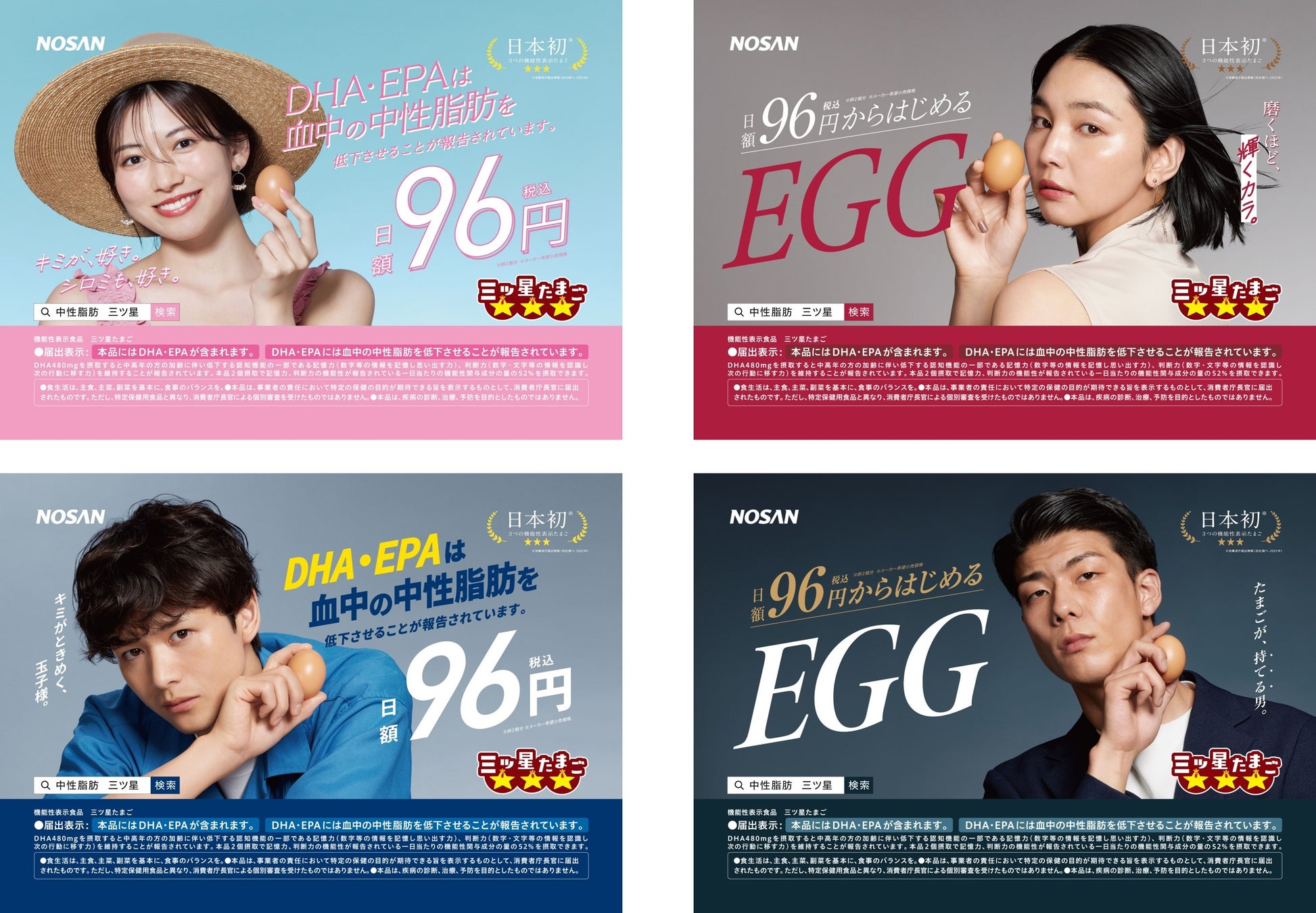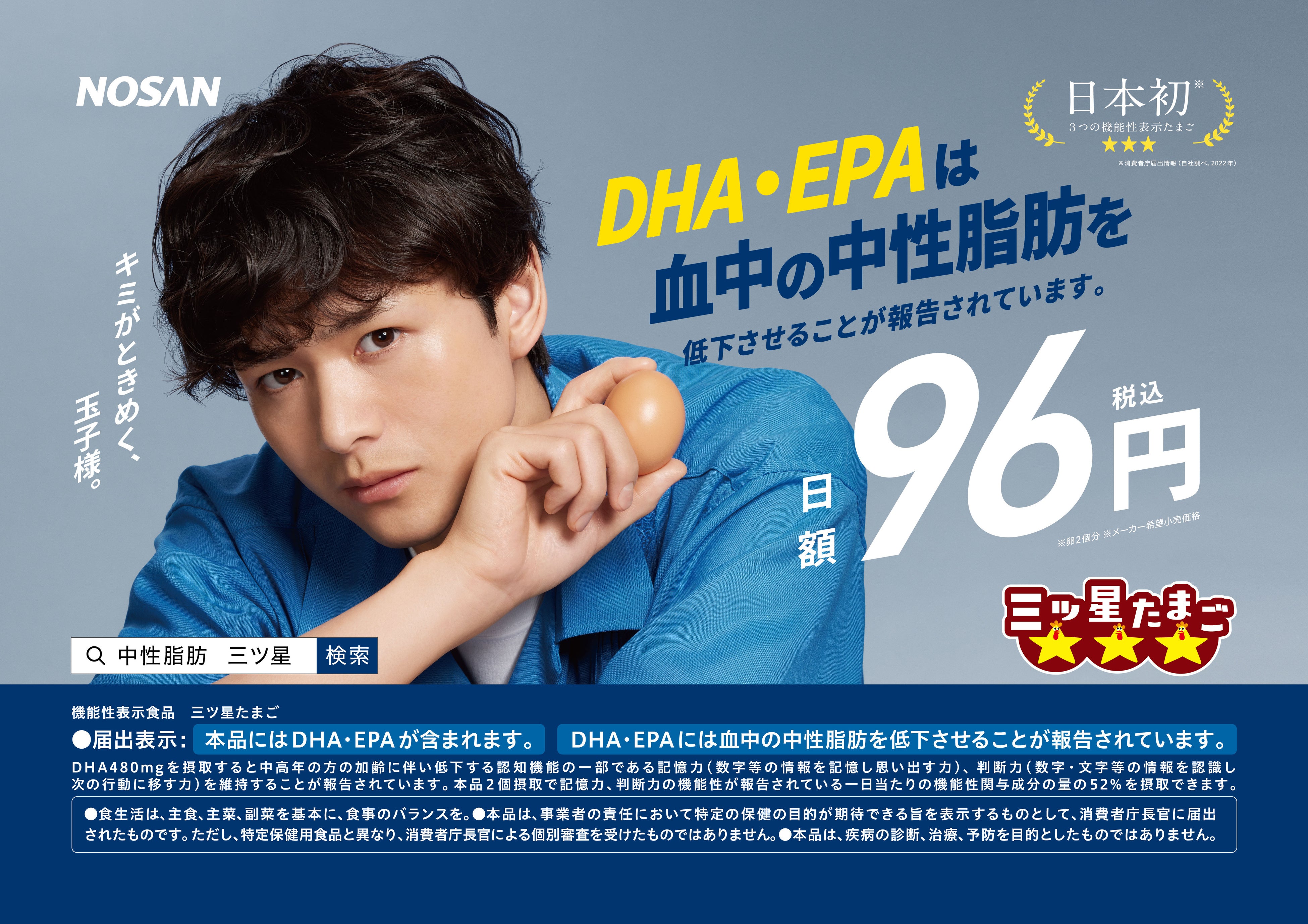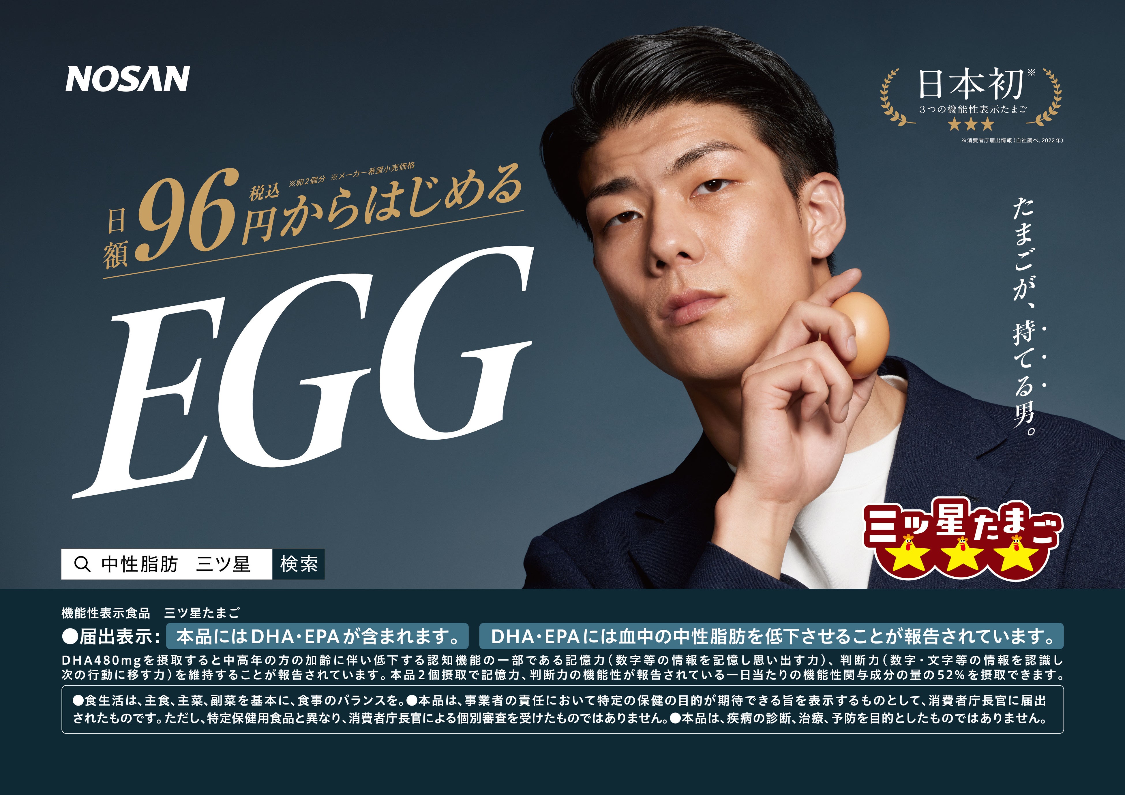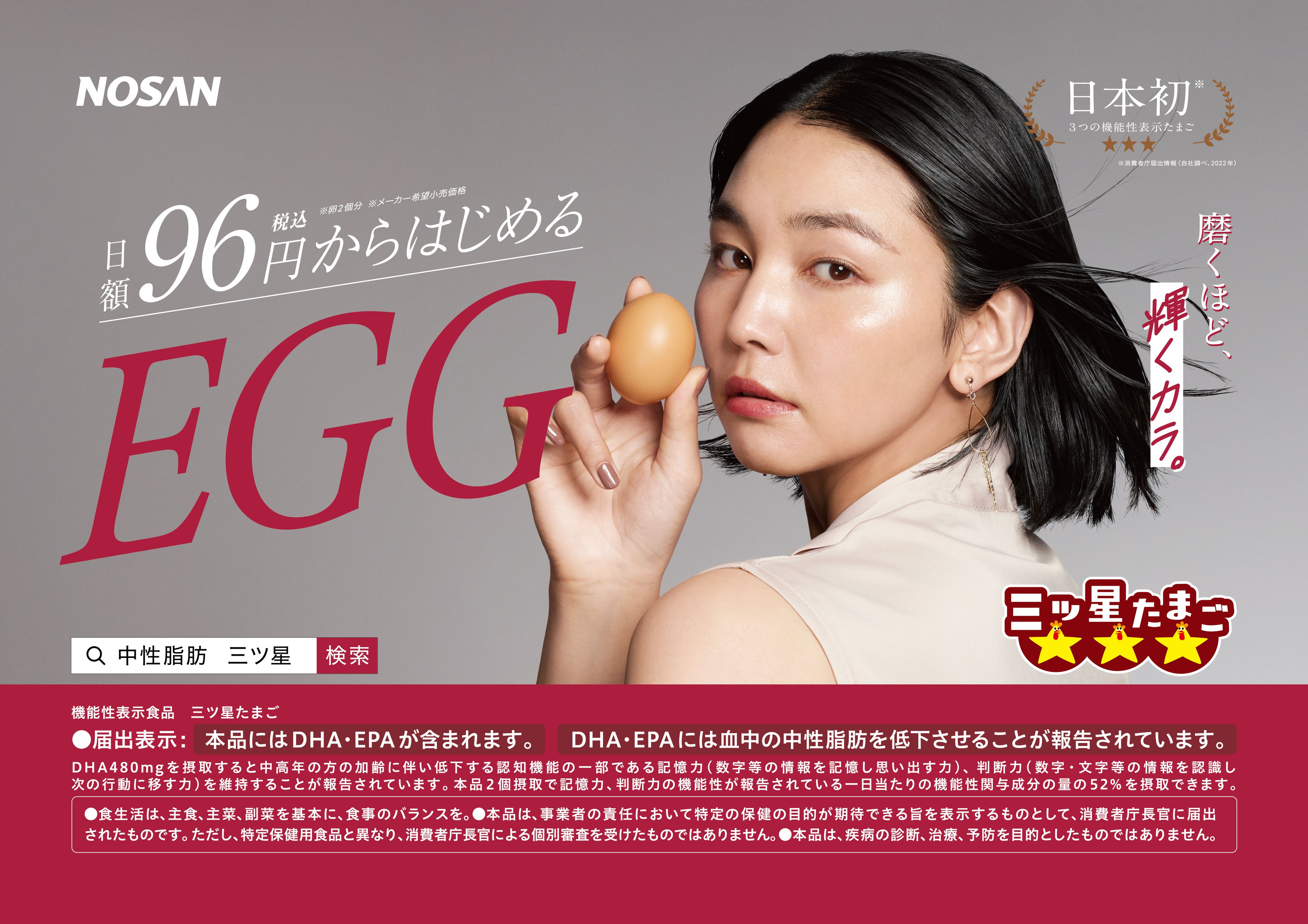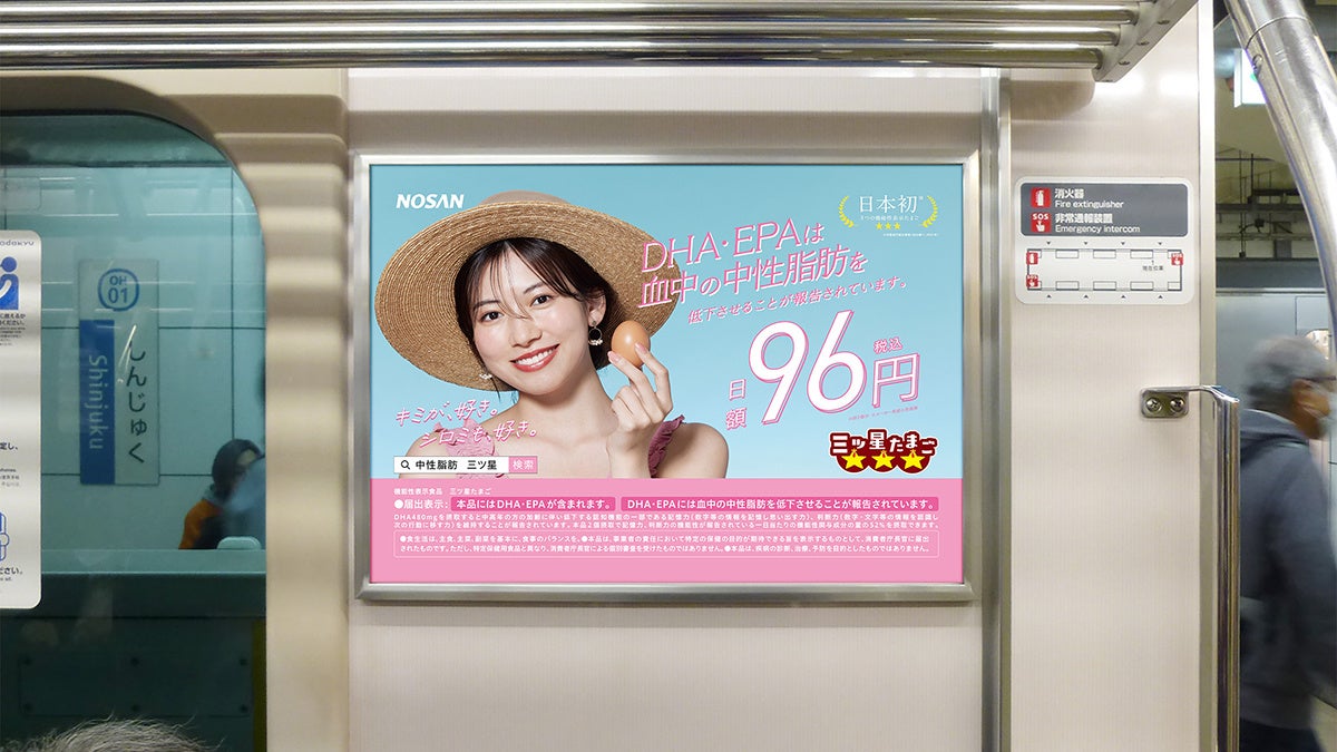 小山 剛)は、機能性表示食品『三ツ星たまご』の新たな交通広告を7月1日から1カ月間、首都圏の電車内にて掲出