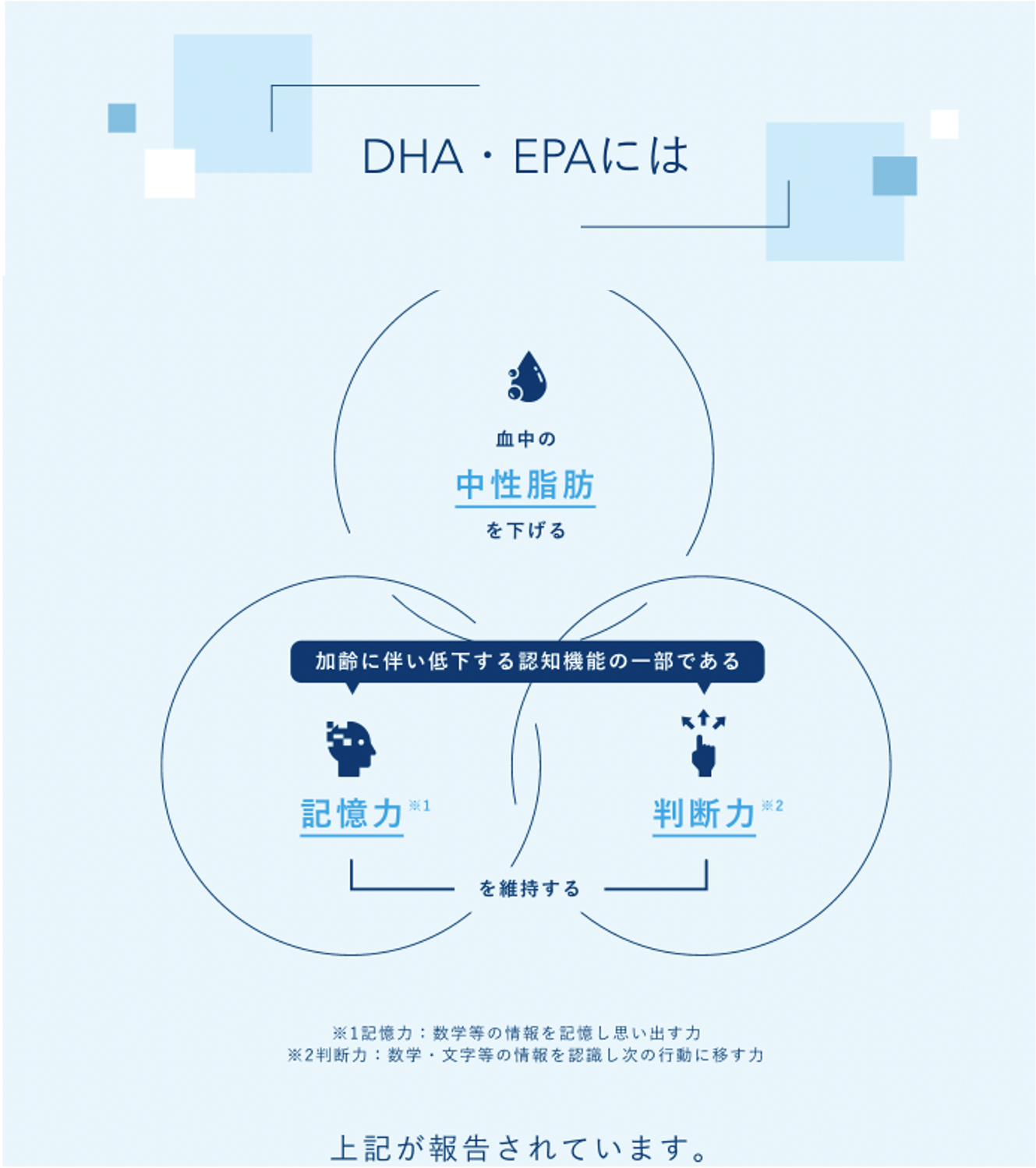 三ツ星たまごにはサンマやイワシなど青魚に多く含まれる、体内で作ることができない「必須脂肪酸」のDHA・EPAが含まれおり、これらには右図の通り3つの機能が報告されております。