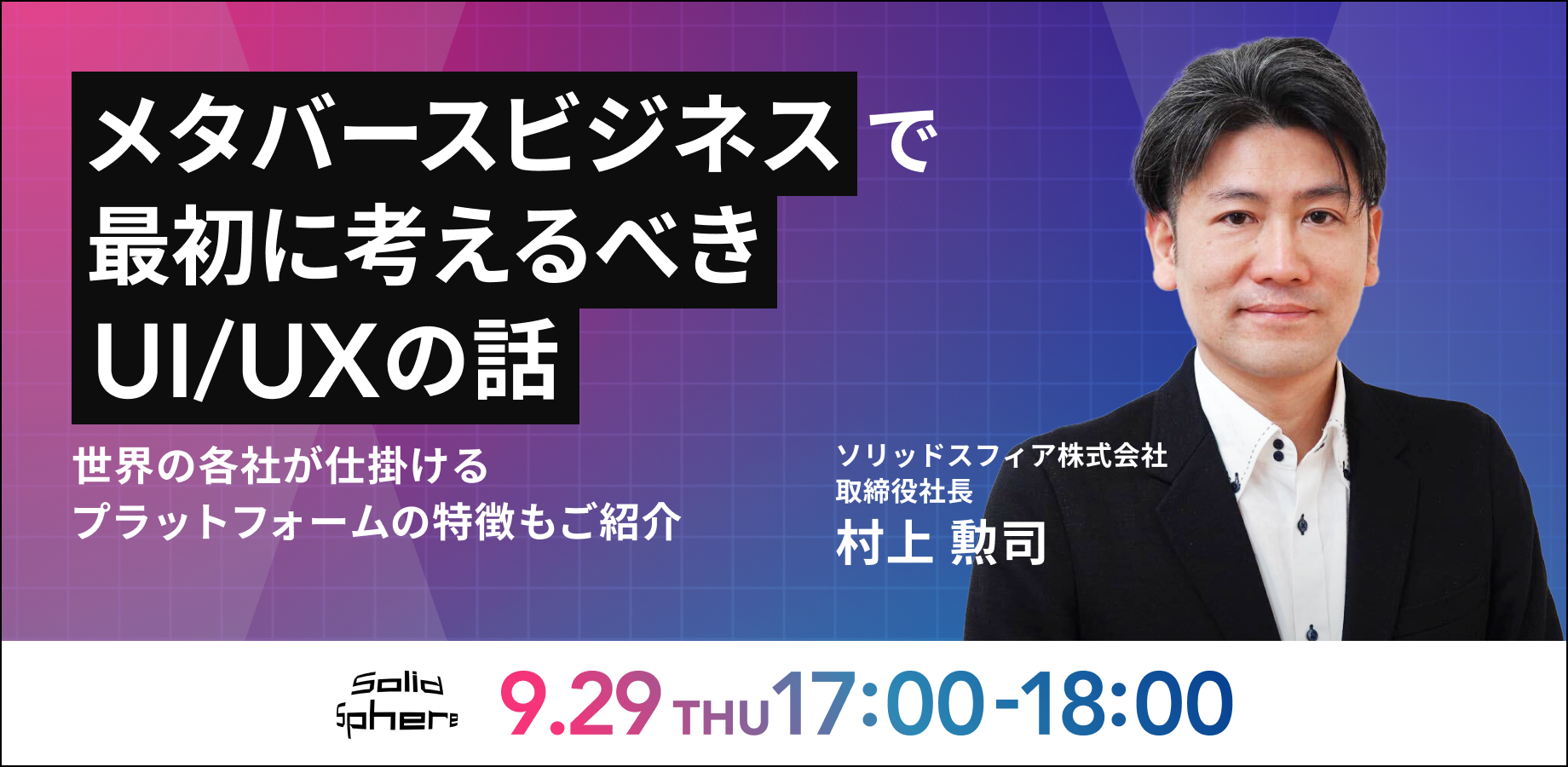 XR(VR、AR、MR)関連アプリ、3D空間(メタバース)での価値体験デザインを手掛けるソリッドスフィア株式会社は、「メタバースビジネスで最初に考えるべきUI/UXの話〜世界の各社が仕掛けるプラットフォームの特徴もご紹介〜」をテーマに2022年9月29日(木)17時よりオンラインセミナーを開催いたします。