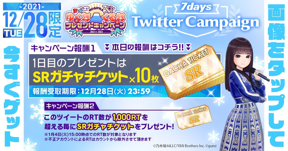 株式会社gumi(本社:東京都新宿区、代表取締役社長:川本寛之)は、『乃木坂的フラクタル』(以下、『乃木フラ』)において、2021年12月28日(火)より、ゲーム内アイテムや乃木坂46メンバー直筆サイン入りグッズ、豪華リアルグッズやギフトコードなどが貰える「乃木フラ ゆく年くる年キャンペーン'21-'22」及び2022年1月3日(月)までTwitter「乃木フラ」公式アカウントにて7日間連続でゲーム内アイテムがその場で貰える「7days Twitterキャンペーン」も同時開催するなど、さまざまなイベントを実施することをお知らせいたします。
