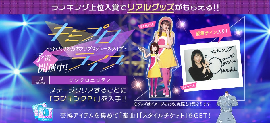 乃木フラではメンバー直筆サイン入りリアルグッズなどが報酬として貰えるイベント「キミプロライブ#02」を開催しております。キミプロライブは、ステージクリアでランキングPtを入手し、他のユーザーと競い合うランキング形式のイベントとなります。 推しのメンバーを1人選び、それぞれの推しメンランキングに参加することができます。今回の推しメンランキングのリアルグッズ報酬は、乃木坂46各メンバーの「直筆サイン入りチェキ」、「アクリルスタンド」をご準備させていただきました。また、本イベントから総合ランキング報酬にもリアルグッズ報酬の「アクリルスタンド」が追加され、ランキング報酬の他にも抽選報酬が用意されているので、ゲームに慣れていない方も気軽にイベントへ参加してみてください。