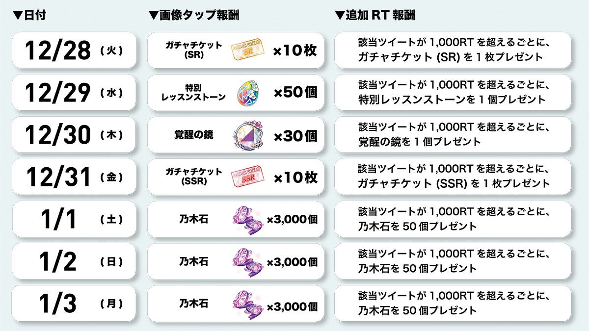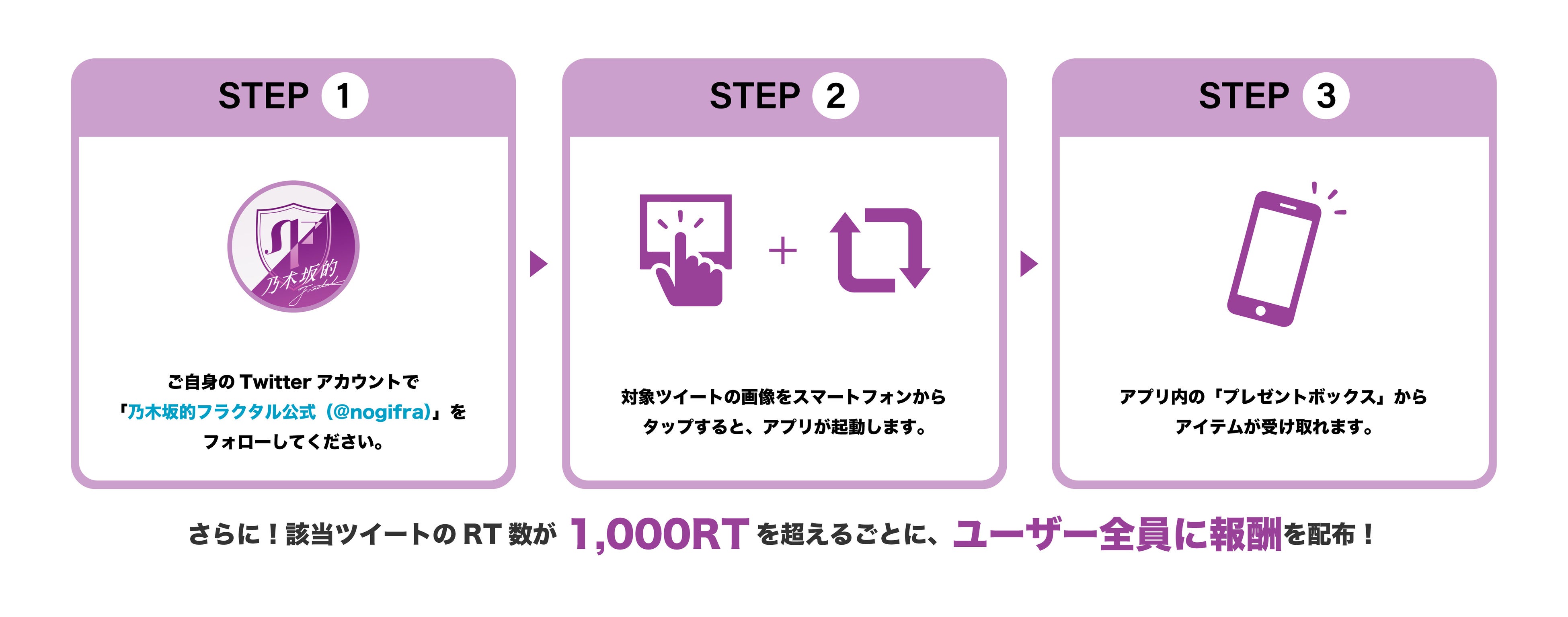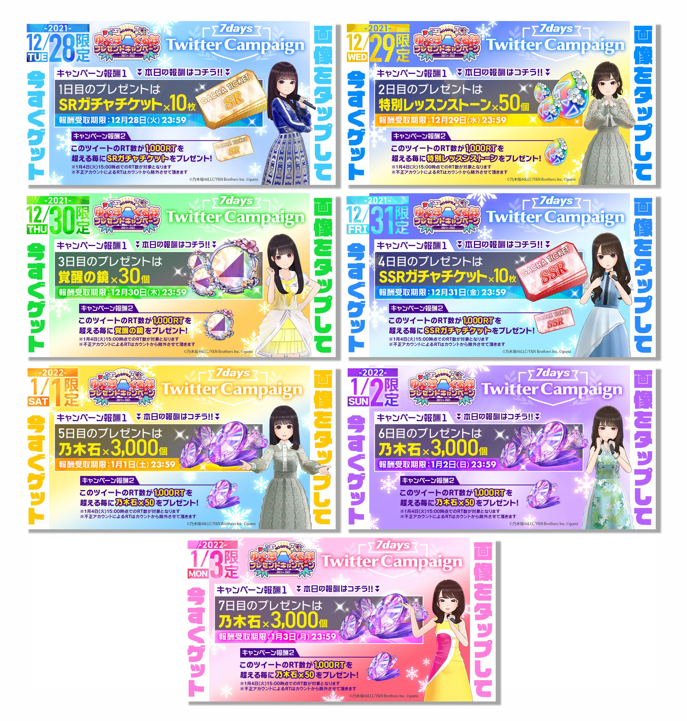 キャンペーン期間中、乃木坂的フラクタル公式Twitter(@nogifra)にて、ゲーム内アイテムが毎日貰える「7days Twitterキャンペーン」を開催いたします。日替わりの投稿に添付された「画像」をタップするだけで、その場で「ゲーム内アイテム」がもらえ、さらに、該当ツイートのRT数が1,000RTを超えるごとにユーザー全員に報酬を配布いたします!