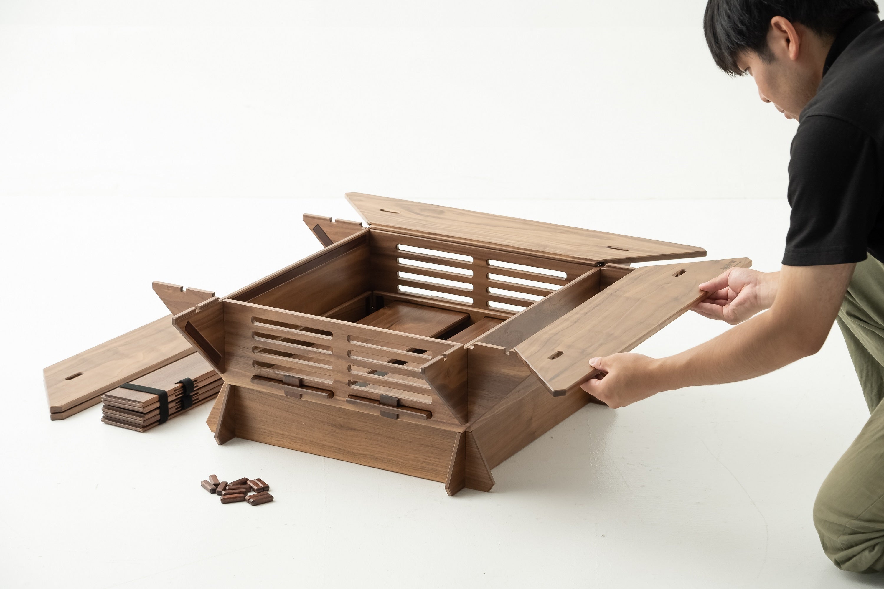 創業77年、伝統⼯芸品の南部箪笥や⺠芸家具の製作販売を⼿がける、株式会社マルイ造形家具⼯業(本社:岩⼿県九⼾郡九⼾村伊保内、代表取締役:千葉暢威、以下当社)は、アウトドア家具ブランドA&D/Wより、七輪囲炉裏の「ブラックウォルナット材」を使用した高級仕様を新たに開発しました。さらに岩手県産木材のクリ材、低価格帯の合板仕様も同時に開発。天板接合方法や細部構造も新しくなり、2022年3⽉8日(火)よりECサイトにて予約注⽂を受付開始致します。