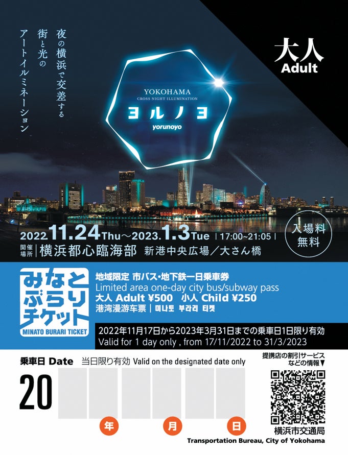 また、横浜ベイエリアの市営地下鉄と市営バスが1日乗り放題になり、チケットの提示でさらにお得なサービスが受けられる「みなとぶらりチケット」をヨルノヨオリジナルデザインで限定3000枚販売するほか、イルミネーションを巡りながら横浜の街を走るランニングイベントを実施するなど、地域の企業等とのコラボレーション企画も展開し、街の賑わいを創出していきます。