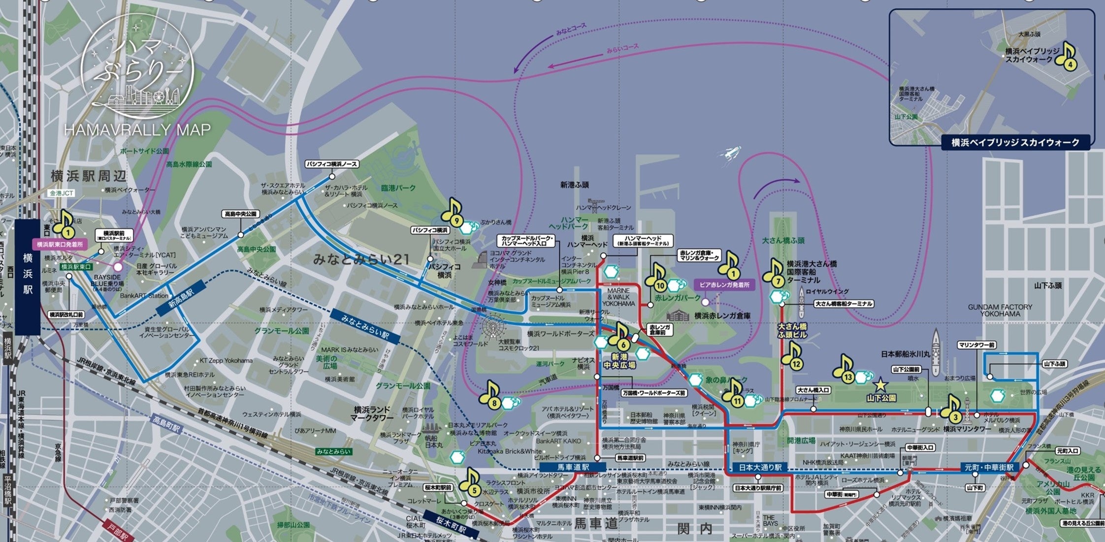 ※上記13か所に加え、横浜ワールドポーターズ館内及びみなとみらい線馬車道駅構内でも音楽が流れます。