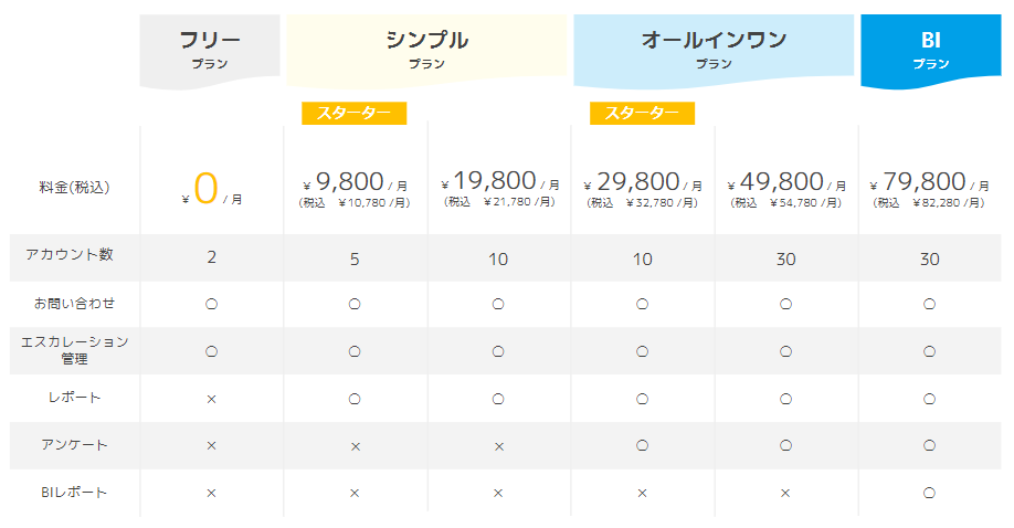 この度、プラン名について機能がイメージしやすい名称に一新し、機能はそのままに、少人数での導入に最適な「シンプル スタータープラン」「オールインワン スタータープラン」を追加いたしました。