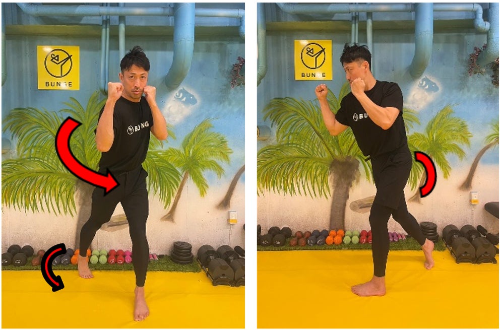 胴体から全身の「ひねってしぼる」動きを意識してパンチやキックをダイナミックに連動させて行います。