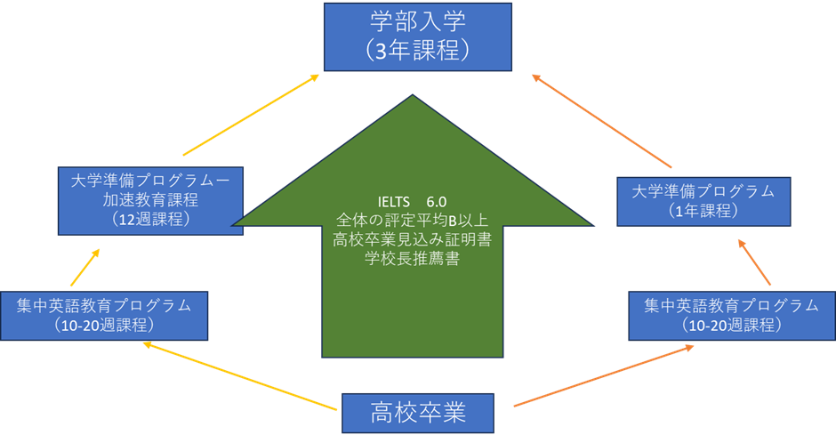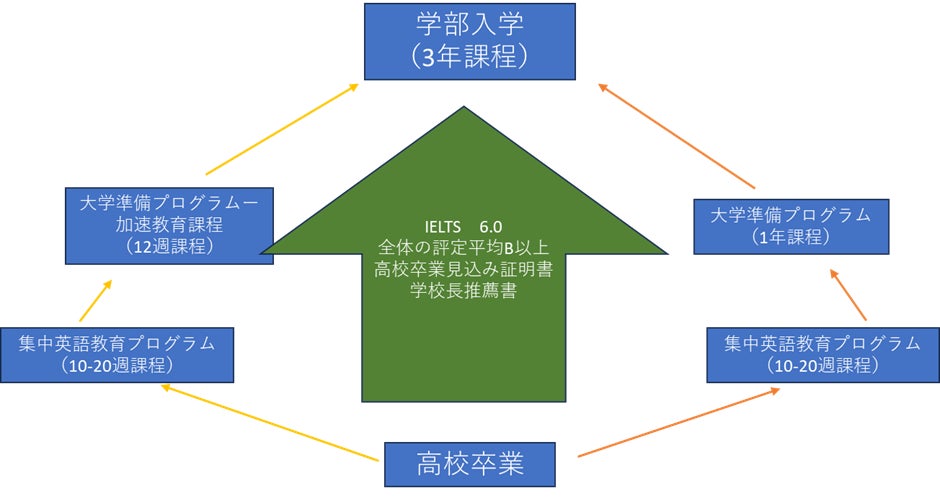 日本の高校の評定平均B以上およびIELTS 6.0(5.5未満のバンドなし)を満たす学生は学士課程へ直接入学可能
