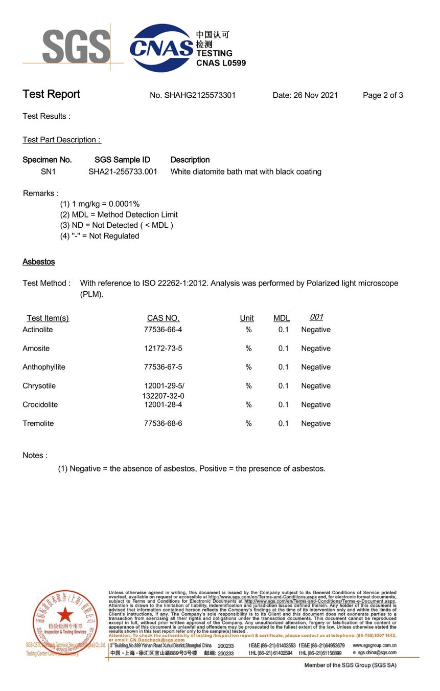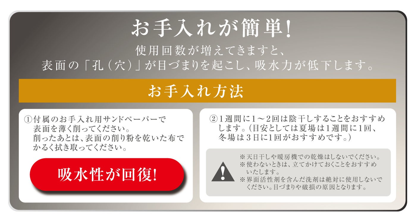また他社の珪藻土バスマットに健康被害のおそれがある“アスベスト”が含まれる事例がありますが、本製品は安心・安全にご使用いただけるようアスベスト検査を行っており、アスベストの含有がないことを確認済みです。