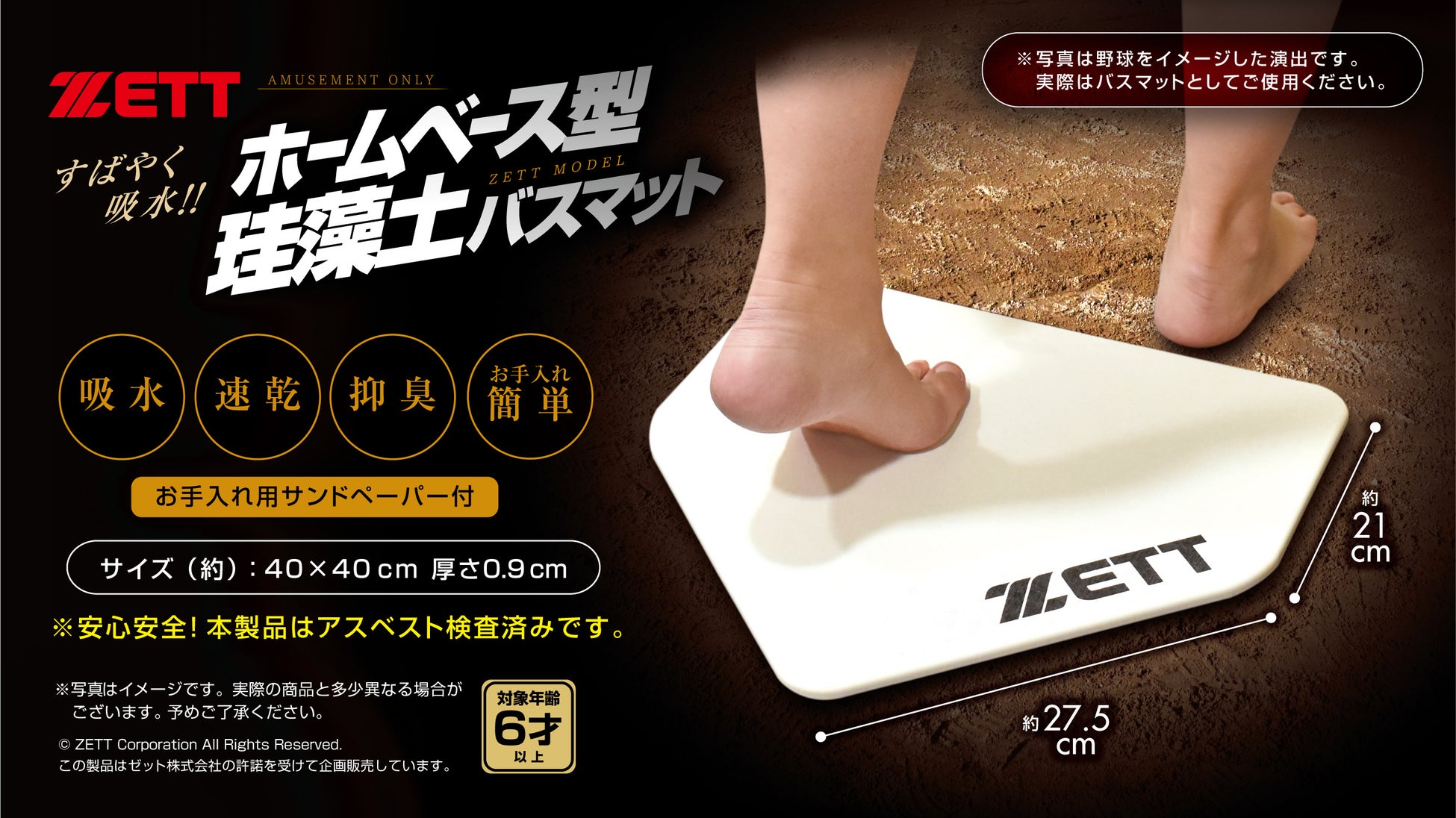 数多くのプロ野球選手も愛用する野球用品ブランド「ZETT」とコラボ!野球のホームベースそっくりの 『ホームベース型珪藻土バスマット』 がアミューズメント施設限定で登場!!