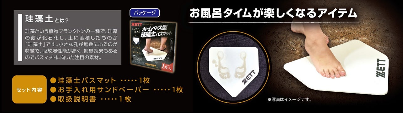 本製品は、吸水性の高い自然素材を使用した珪藻土バスマットを菊屋 株式会社(本社:群馬県高崎市)が製造。野球のホームベースそっくりに型取った5角形の形状で、ホワイトカラーの珪藻土バスマットにZETTのロゴを印字したアミューズメント限定デザインとなっております。この商品を置くだけで毎日のお風呂タイムが楽しくなる野球好きにはたまらないアイテムです!