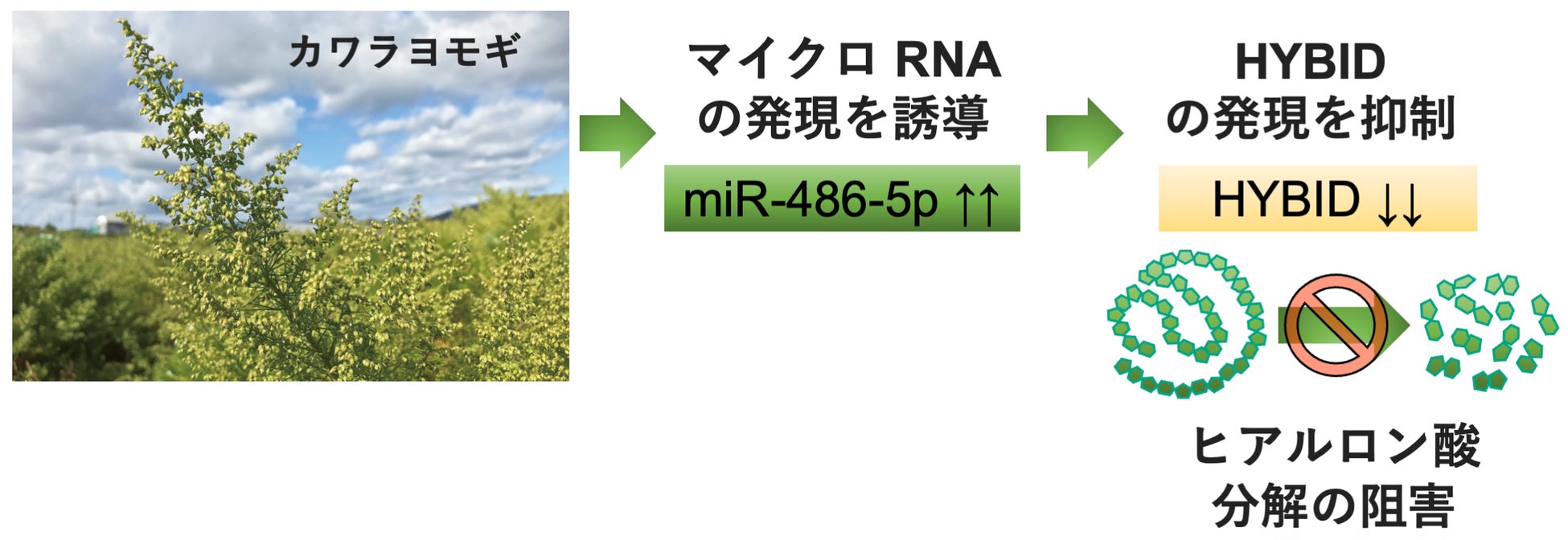 ヒアルガードについて、発売後もその機能性の作用機序や活性成分の探索を続けてきましたが、カワラヨモギエキスの中でHYBIDの発現を抑制している未知の成分を発見、この化合物に植物の日本名から、Kawarayomogin(カワラヨモギン) I 及びKawarayomogin IIと名付けました。さらにこれら新規の活性成分を含むカワラヨモギエキスは直接HYBIDの発現を抑制しているのではなく、マイクロRNAであるmiR-486-5pの発現を上昇させることで、エピジェネティックに HYBID の発現に影響を与えていることを突き止め、英科学誌「Scientific Reports」に投稿し、このたびその論文が掲載されました。