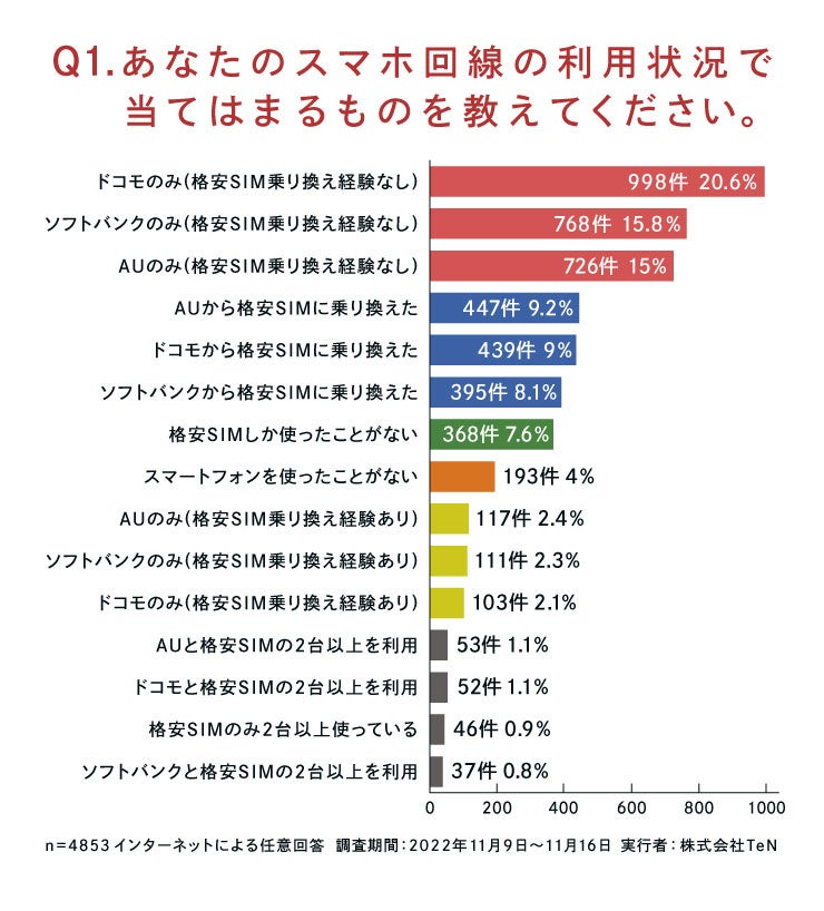 株式会社TeNと株式会社レプロエンタテインメントが共同運営しているin net(https://www.lespros.co.jp/media/)はドコモから格安SIMに乗り換えたことのある4853人を対象にスマホ回線の利用状況のアンケート調査を行いました。