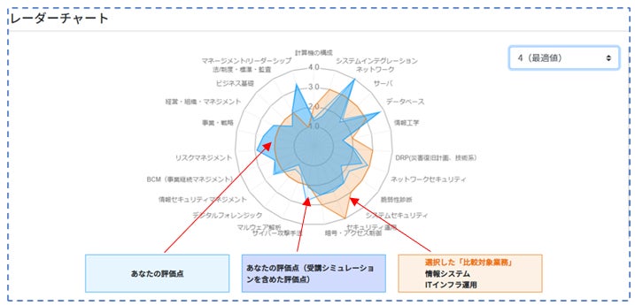 業務経験年数や保有資格、講義受講等を入力すると、IT技術領域、セキュリティ技術領域、ビジネスを推進する上で必要なマネジメント系領域などのスキルレベルバランスが自動判定されます。さらに、いろいろな業務の理想スキルバランスとの比較ができ、ギャップに対しての対策が効率的に検討できます。