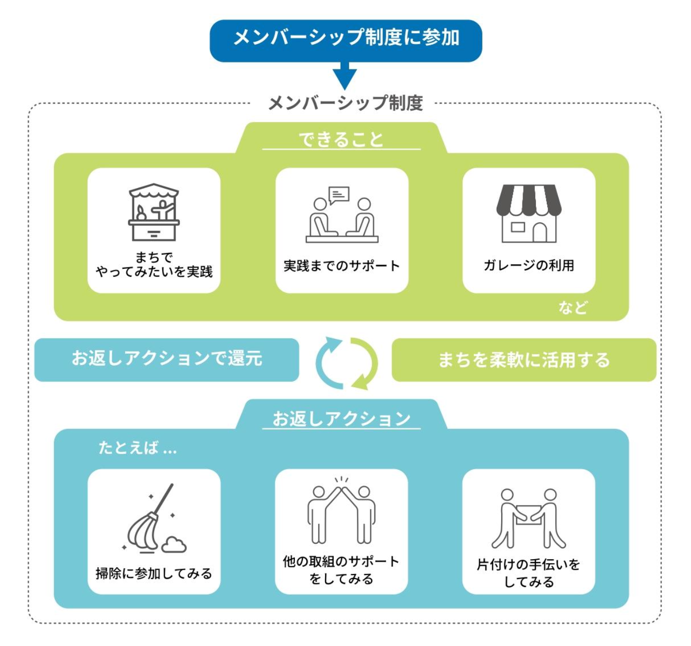 そのため、メンバーシップ制を導入し、まちを自分ごととして考え、関わり続ける人たちが、ガレージの機能を活用できる仕組みとしています。