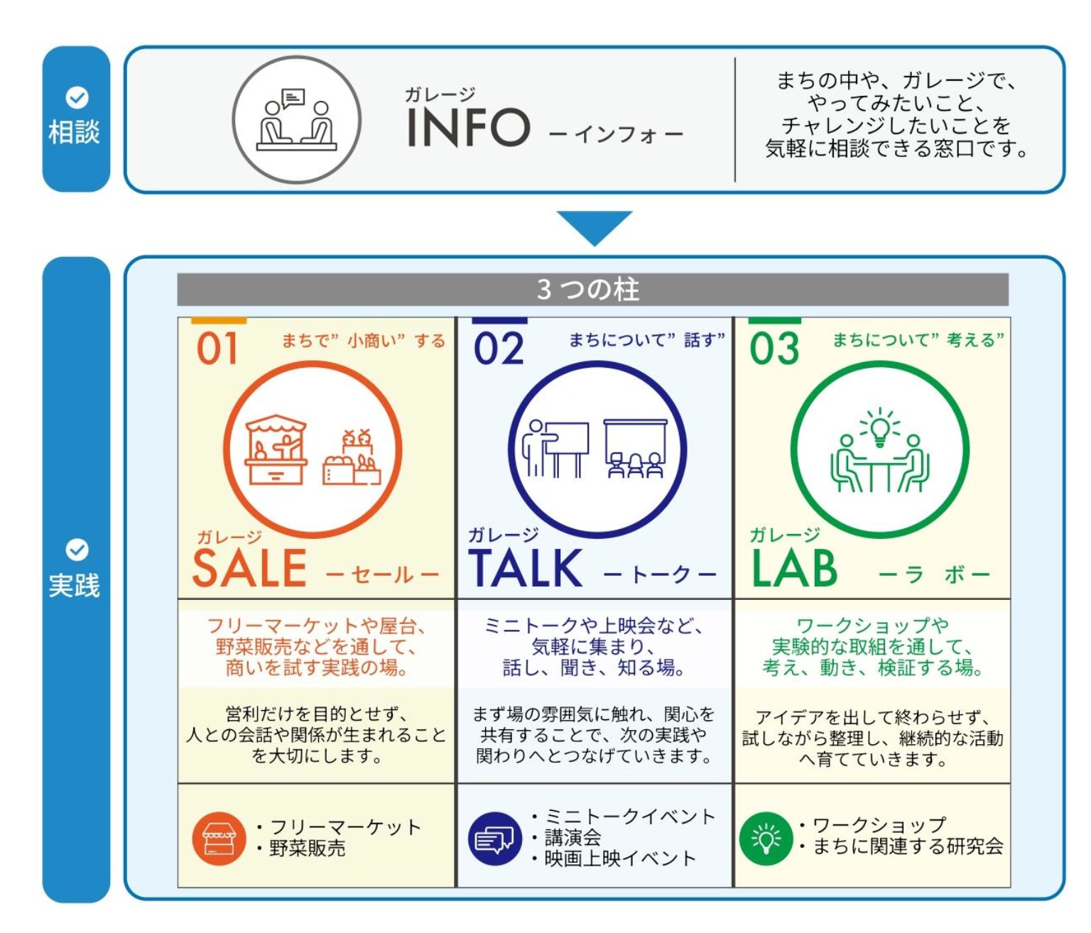 ここでの相談をきっかけに、ガレージセール・ガレージトーク・ガレージラボといった実践の場へとつなげていくことを想定しています。