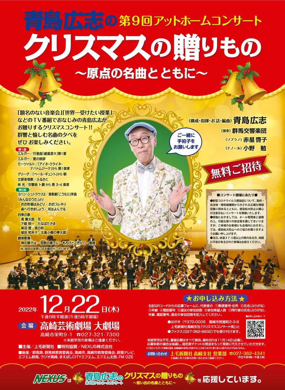 2022年12月22日(木)NEXUS特別協賛、青島広志の第9回 アットホームコンサート が開催されました。このコンサートは NEXUSのSDGs活動の一つ、文化・芸術活動支援企画として、クラシック音楽を気軽に親しんでもらうため、毎年クリスマスに恒例開催となった音楽イベントです。