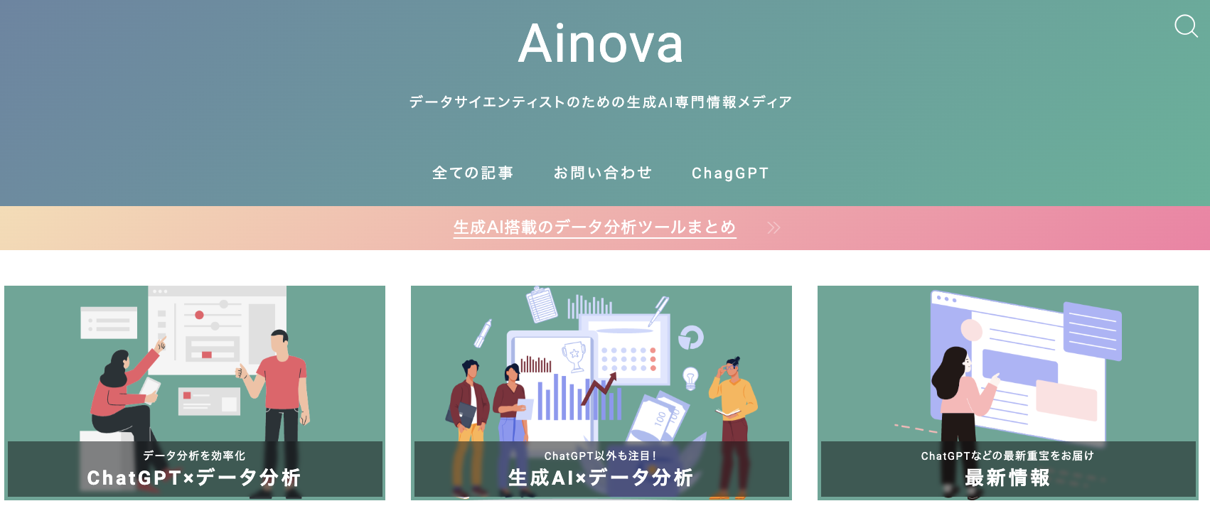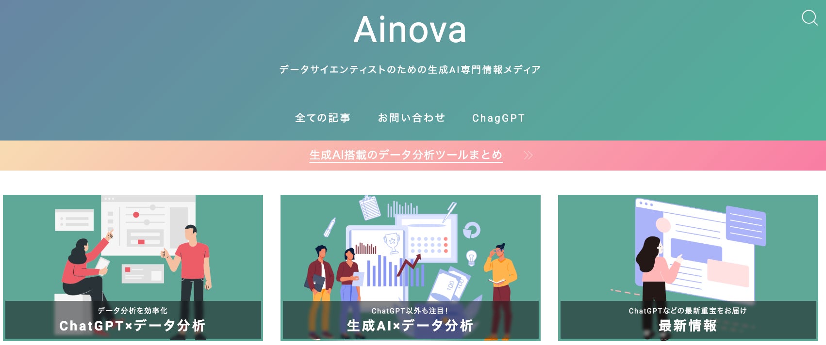 Ainovaはデータ分析と生成AIに特化した専門情報メディアであり、生成AIとデータ分析を組み合わせた最新の情報と共に、他のメディアでは取り扱わないようなニッチな情報や、実際に体験した情報をお届けいたします。