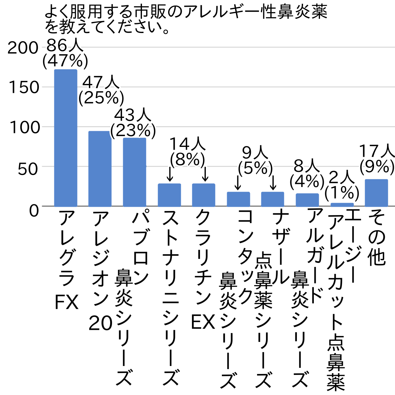 アンケートでは次に、よく服用する市販のアレルギー性鼻炎薬について具体的に尋ねてみました。