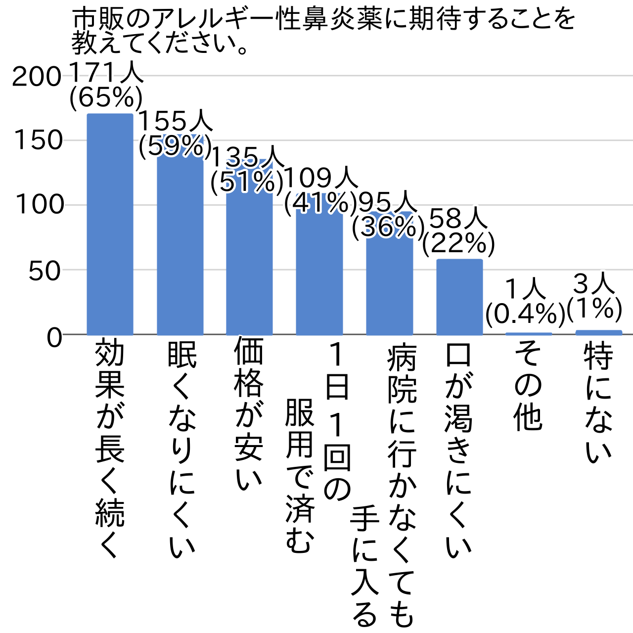 市販のアレルギー性鼻炎薬に期待することの第1位は「効果が長く続く(171人)」で、市販のアレルギー性鼻炎薬の服用可能性がある方のうち7割弱(65%)を占めました。これに関連して「1日1回の服用で済む(109人)」という意見も多く集まりました。